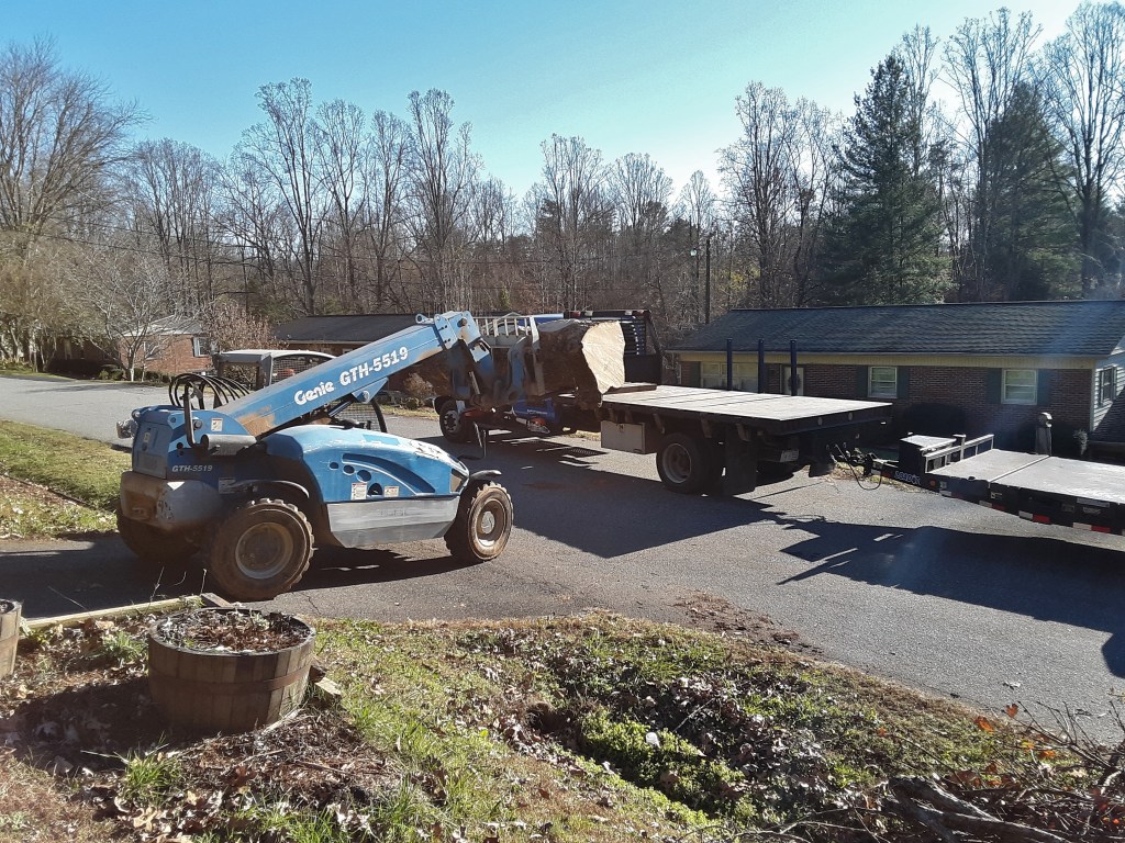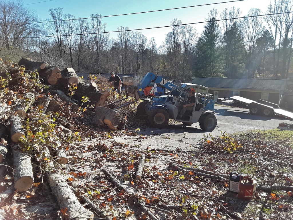 The ironworker/woodworker has all of the toys. Below he is clearing the smaller pieces in order to drag the trunk down to the driveway. The front and rear wheels of the forklift steer. It is not quite “zero-turn” but close.