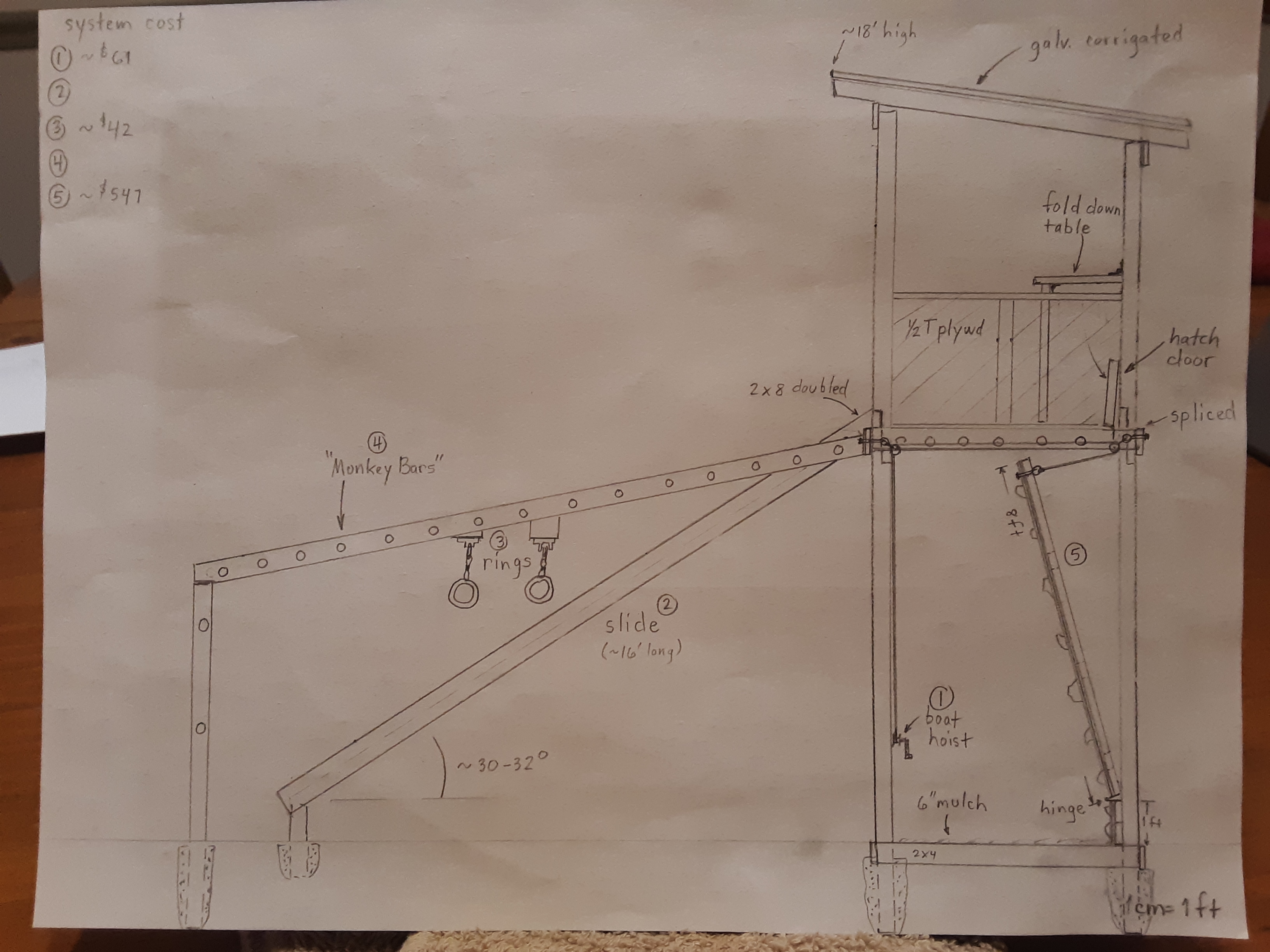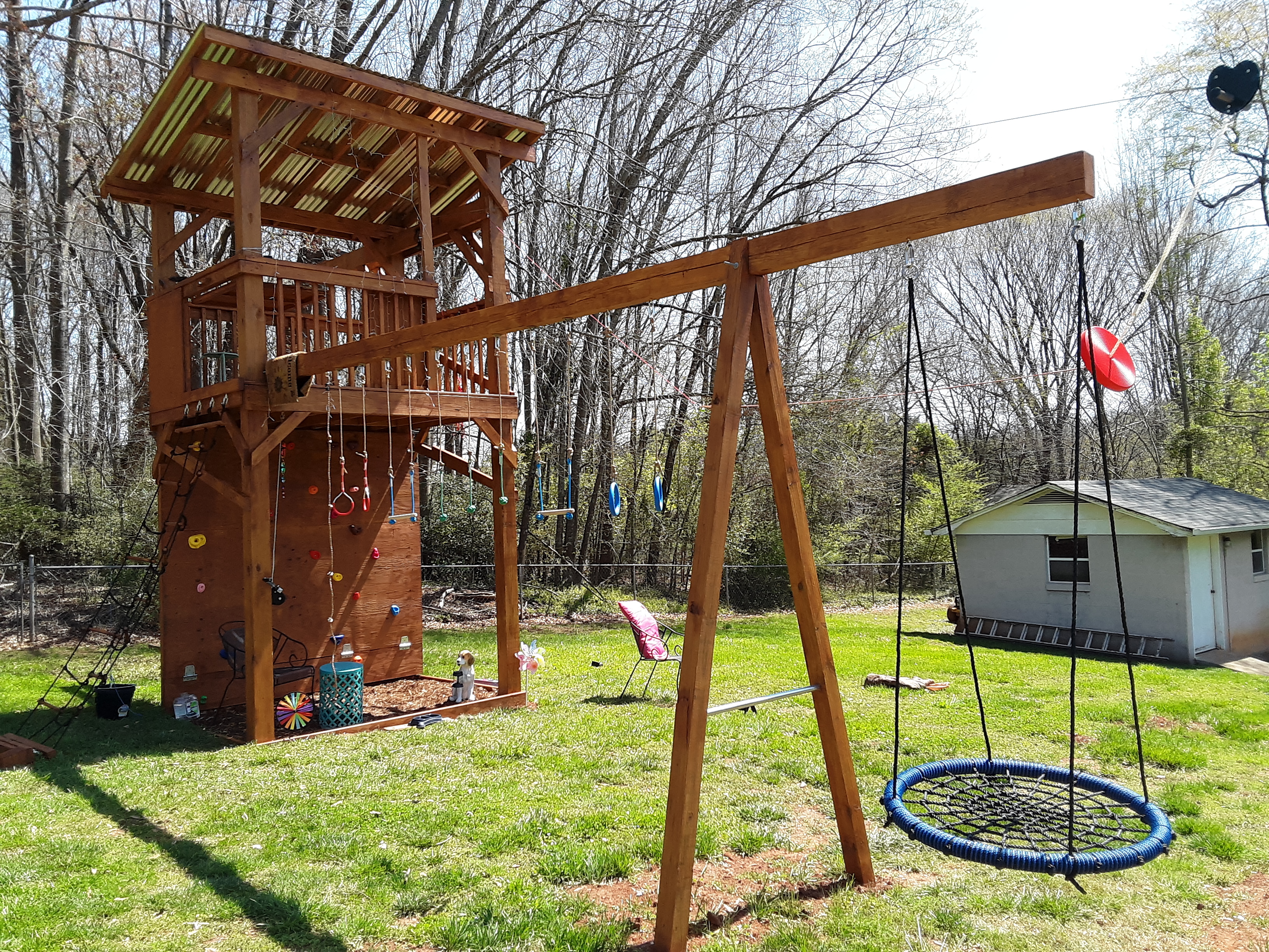 Check out the plans. The basic concept is there, but the homeowner wanted the addition of a climbing net, a zipline, a beam for the aerial silk, and a good place to mount the net swing. For cost reasons that eliminated the slide and monkey bars. The fold down table became a doorway for the climbing net. The climbing wall got lowered from 9′ to 8′ and 7′ wide to 8′ wide. The zipline resulted in changing from 4 x 4 posts to 6 x 6 posts and adding all of those diagonals.