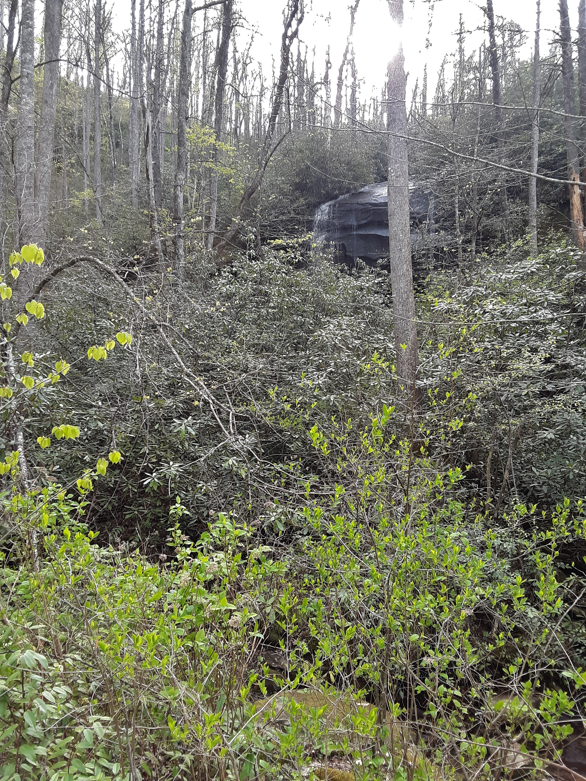Two fires in the last dozen or so years have robbed the cliff base of its shade, but that in turn is generating a fast renewal. It seems early for Frazier Magnolia to be blooming, but there it was.