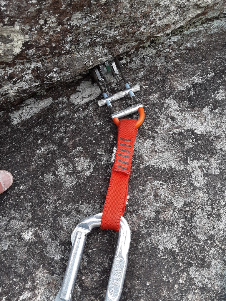 When you trad (4) climb you place protection devices like stoppers, hexs, tri-cams, slings, or cams like the one pictured here. Then you clip your rope into a carabiner attached to the end that catches your fall. This was a solid or ‘bomber’ placement. There are sections on this wall and this climb where there are handholds but no placement for protection. This results in a run-out situation. By the way, do you see how I mark my equipment?