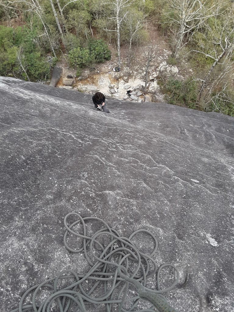 I belayed my partner from the top. Here he comes. I holding firmly on the brake hand while I take the picture with my other hand, resulting in only a momentary lapse in rope management, though not compromising safety in any way.