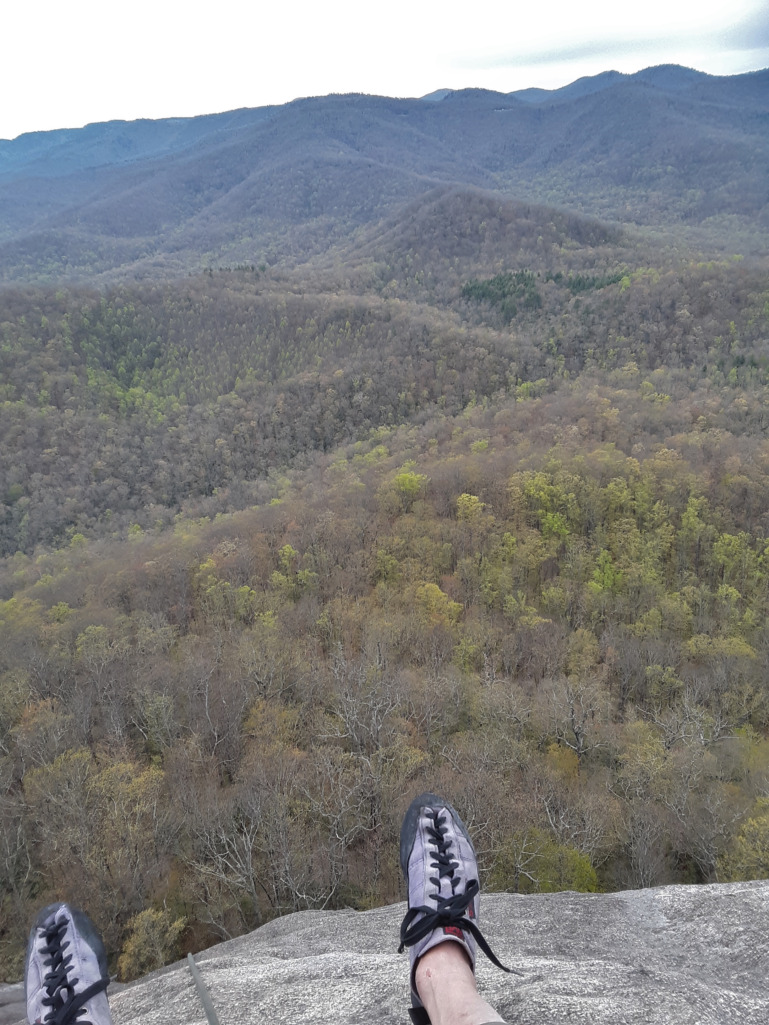 Last weekend my youngest son, climbing partner, and I started at the Sitting Bear parking area, hiked to Hawksbill, climbed the two easier pitches of Lost in Space and Star Trekin, hiked to Devil’s Cellar at Table Rock, climbed again on Helmet Buttress, and walked down to the Table Rock parking area. See the pictures at HB and TR.