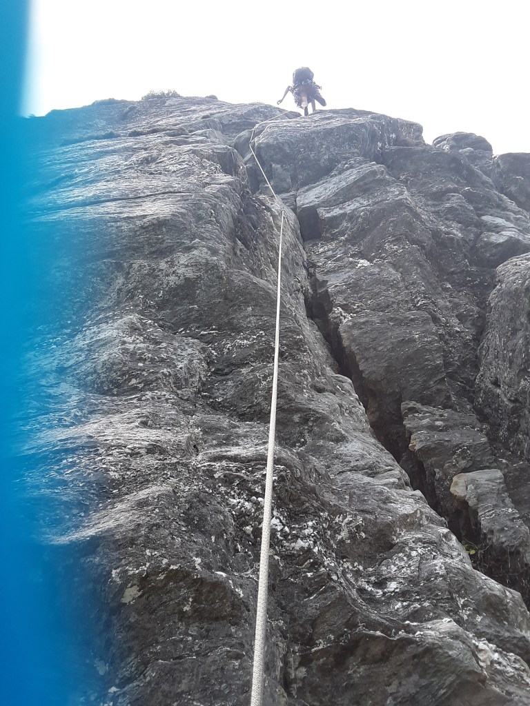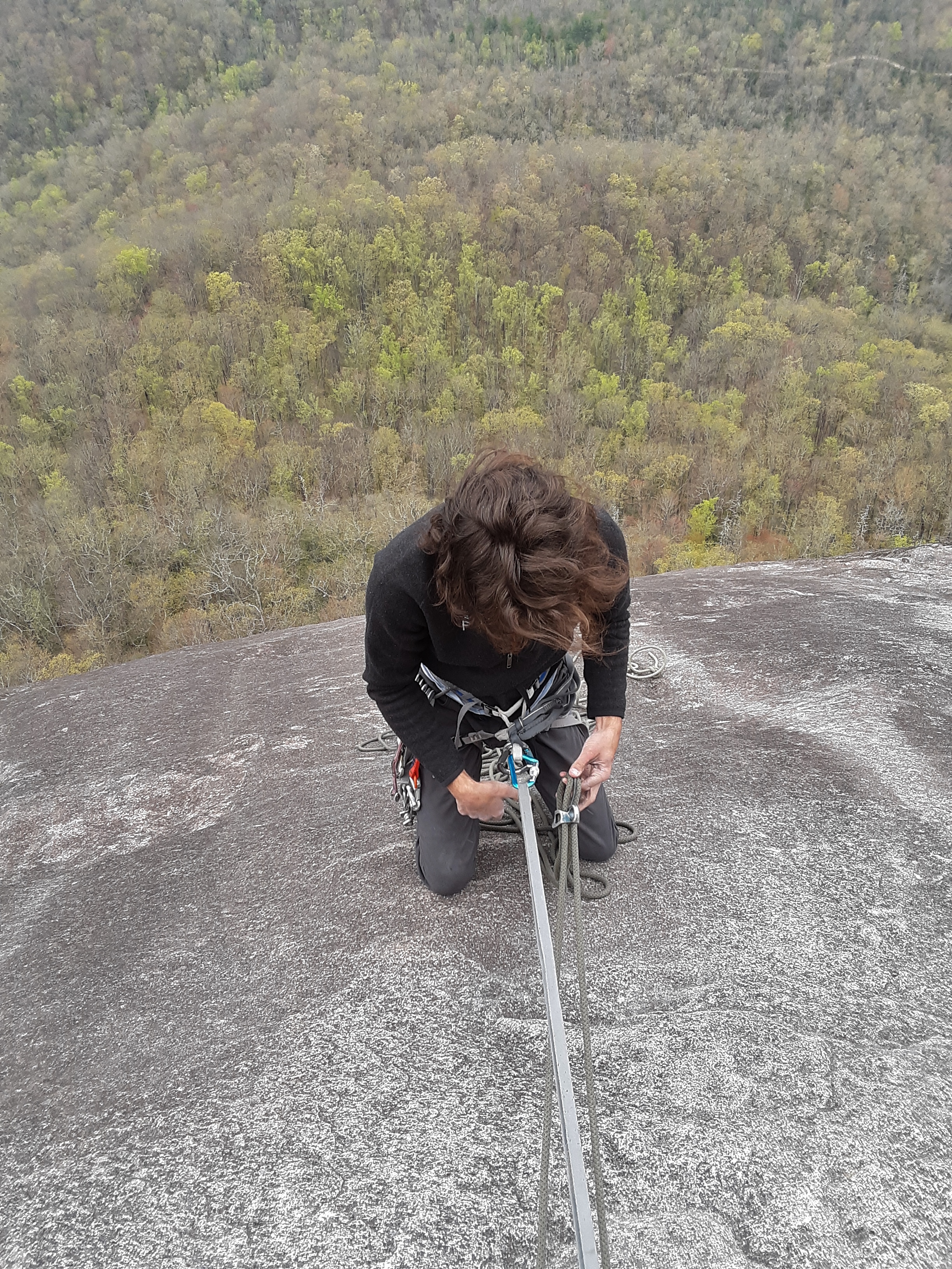 Time to rappel back down. Once again it looks nearly flat in the foreground but isn’t. The blue device through which there are two bites of rope in his left hand is called an ATC (5).