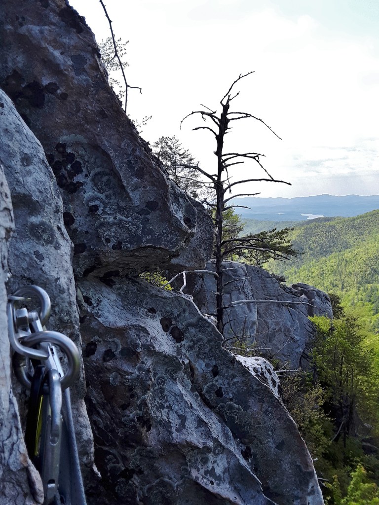 The stainless steel rings at the top of a sport climb are secure, giving a comfortable stance for looking around. The black lichen looks like pits in the rock, but aren’t. I cannot figure out the dead pine tree. Am I seeing another tree behind it cause the bizarre shape appearance of the trunk, or is it really that odd looking?