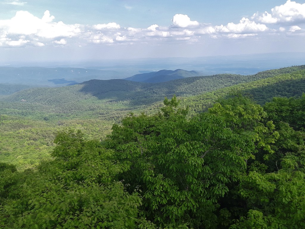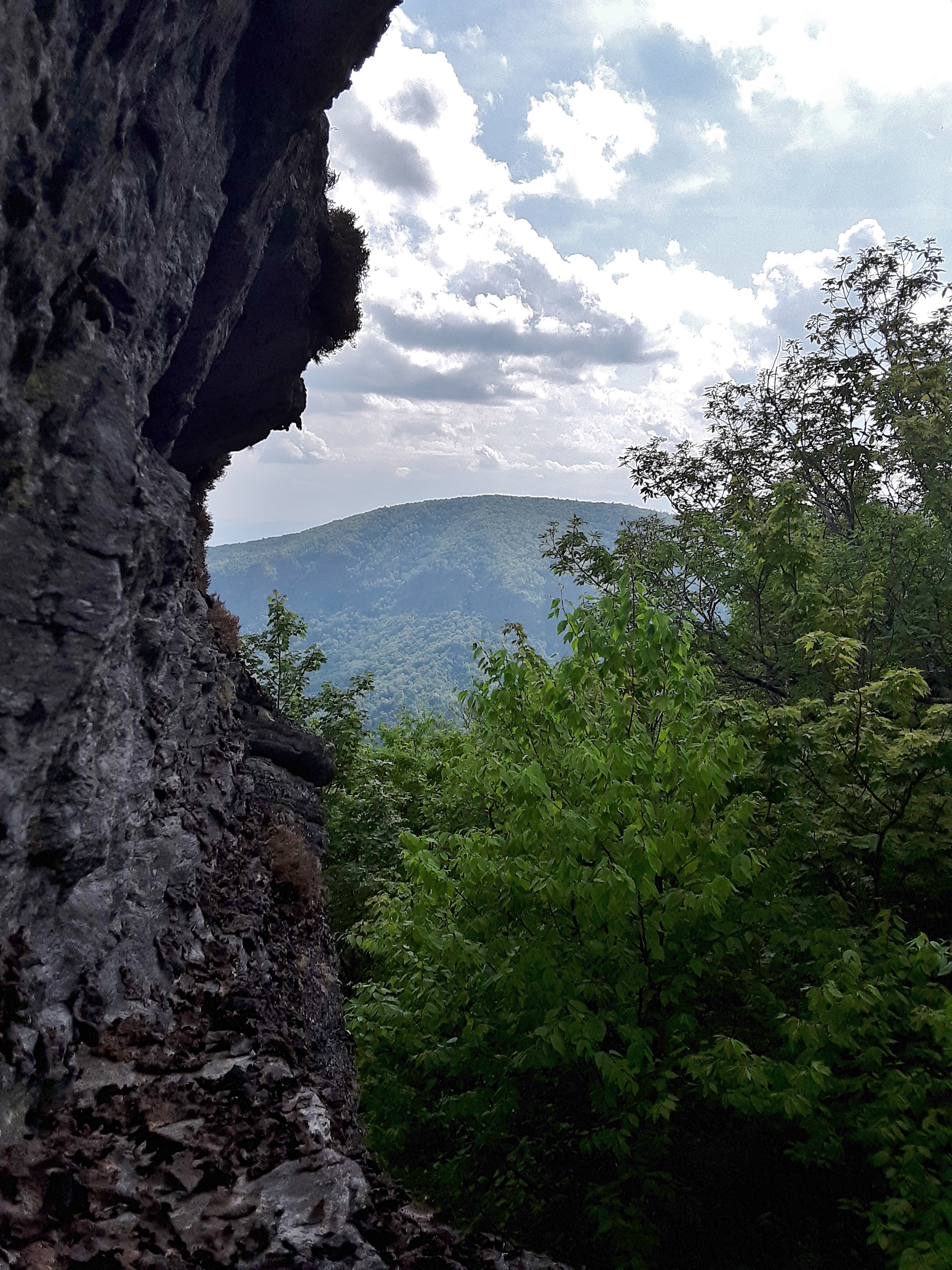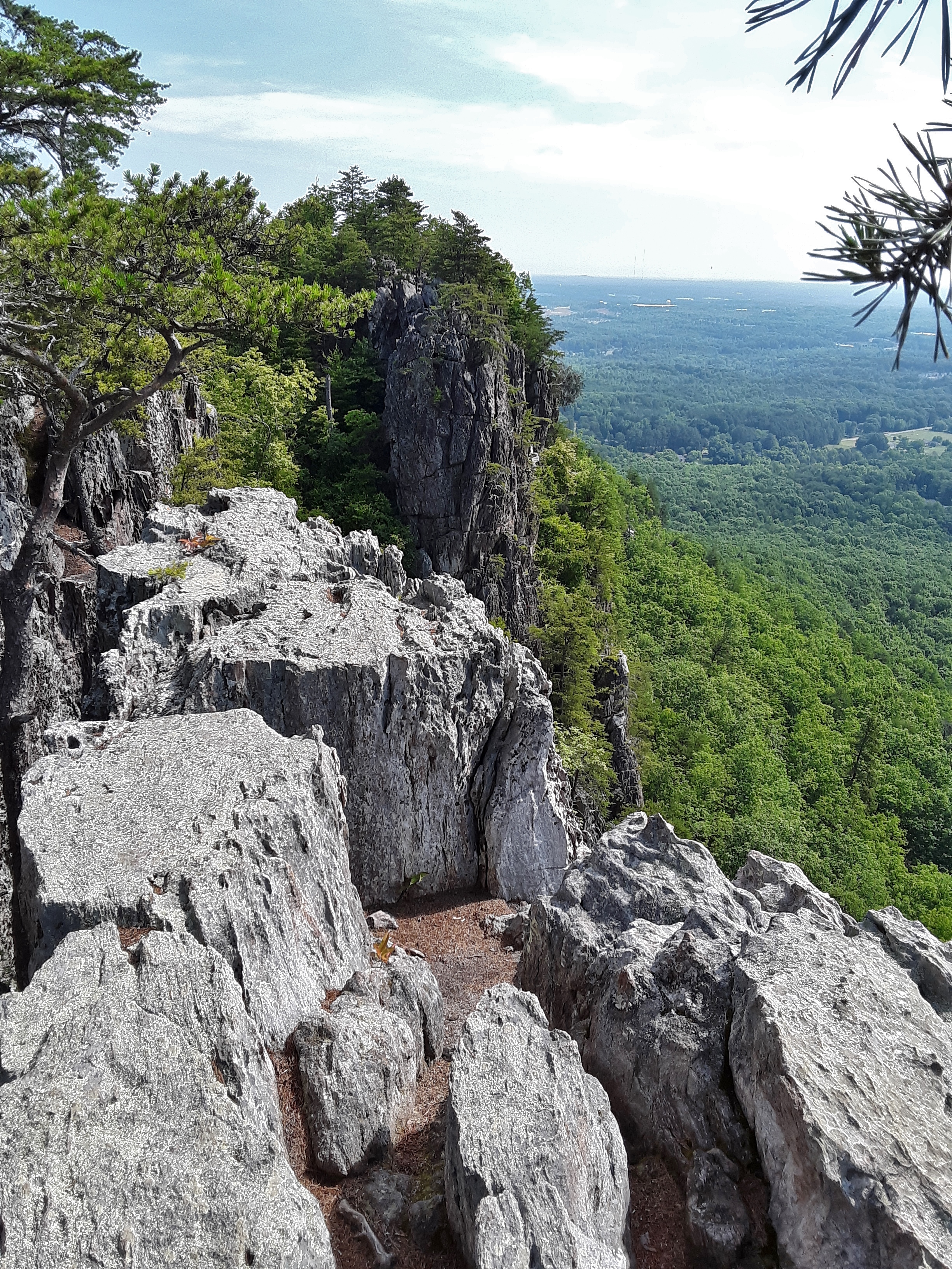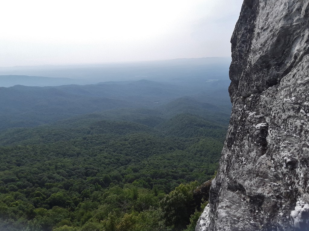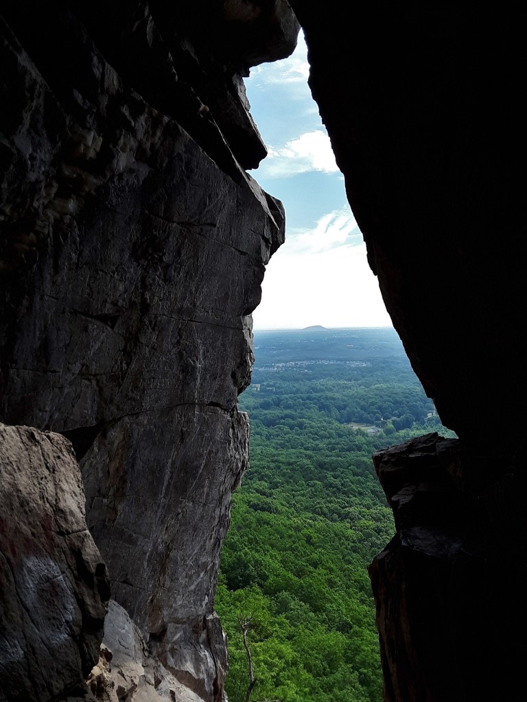 At 80 feet the climb goes into a cave, open at both ends. The belay station was cooled by shade and cool air drawn through the opening with a comfortable stance and a nice view. The view is toward the East and Jackson Knob just south of Gastonia.
