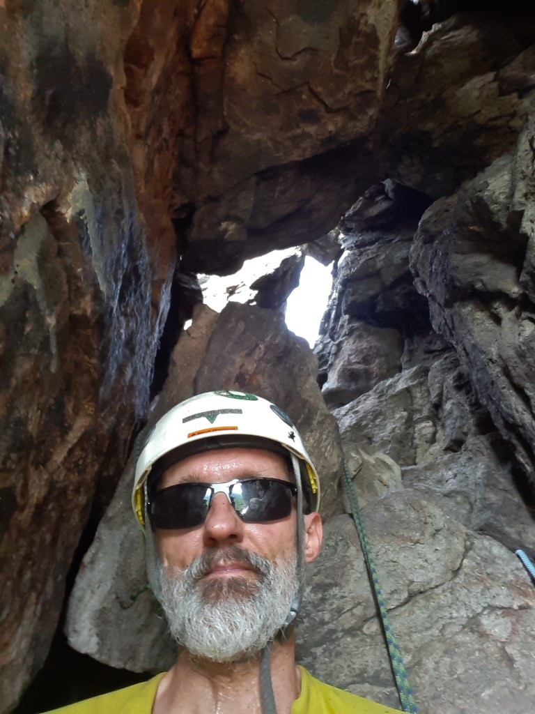 In the following selfie you can see the reflection of not only the phone with which I am taking the picture but also one of the bolts to which I am attach and my partner is rappelling and the tree line at the top of the peak.