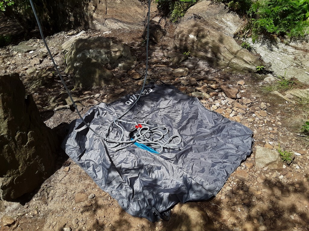 Interacting with a friend on FB with whom I had previously climbed several years ago, we decided to get together and go climbing again. He lives near Crowder Mountain State Park and has been climbing more frequently there of late with a friend. When we arrived the expanded parking lot was already one third full at just after 8 AM: climbers, hikers, and trail runners preparing equipment and signing release forms. The friend knew the various walls and suggested that we head for the back side of David’s Castle to avoid the anticipated muggy radiation on the sunward side. When we arrived and looked over the front side of the wall, I was enamored by the prominent crack front and center. He said it was a 5.7, so I thought it would be a good climb to warm up on and lead before the sun got too hot. My friend had bought a new 60 meter rope that had only been used once. It came with the most convenient rope tarp/carrying sack. You can tell by the rocky ground that this is a heavily visited climbing site.