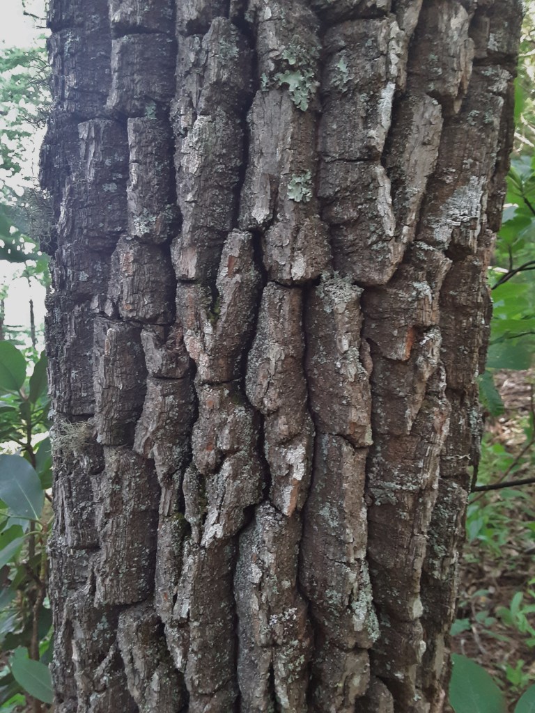 My partner realized just after we left the parking lot that he had forgotten his climbing shoes. So while he went back, I had a few moments to reflect on the surroundings. Sourwood bark has character and so much “scope for imagination”, as Anne of Green Gables would say. The furrows and ridges could be dragon skin or climbing holds or tire tread. What does it remind you of?
