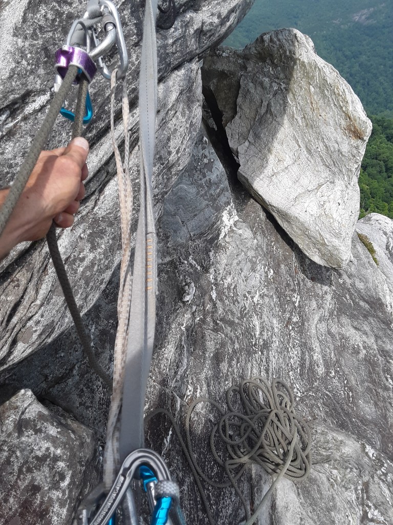 Still in training for a late summer climbing bonanza, my partner and I headed out on Friday to do a few of the routes on Shortoff in Linville Gorge. The hike up from the parking area is about a mile and a half through recovering forest after forest fires about a dozen or so years ago. There is some shade beginning to form, but most of it today was the partly cloudy haze out of a super-humid July day. When you reach the top there are breathtaking views of Gorge and Foothills region. The difficulty of access to these climbs is the topography, the whole reason we are here of course. You have to drop down a very steep gully about 150′ vertical and then rappel another 100′ to the bottom. Getting to the rappel station was the scariest part of the whole day.