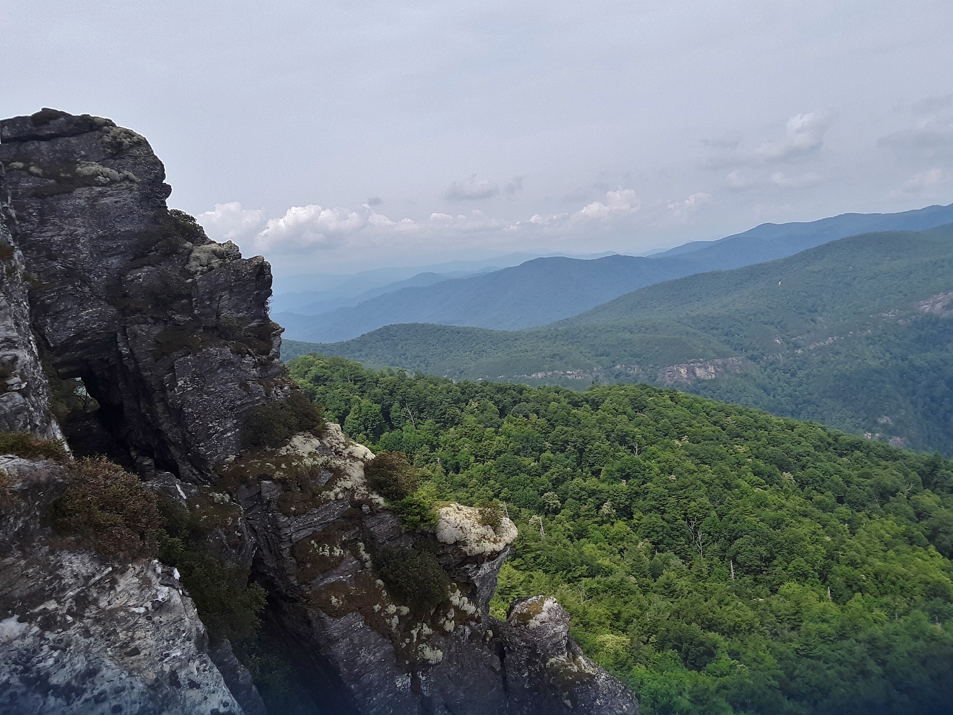 Given the humidity and scattered showers, you really couldn’t see all that far, but the Gorge is impressive anyway. The mountain top cliff on the left is Hawksbill with Table Rock hidden behind it. Beyond that is a darkly shadowed mountain where resides the North Carolina Wall. The mesa shaped, flat top mountain is Shortoff. The right side or West side of the Gorge is Jonas Ridge upon which the gravel Hwy 105 runs. An indication of how dry it has been is the brown moss on bare rock. It must be a harsh environment for moss to survive in.