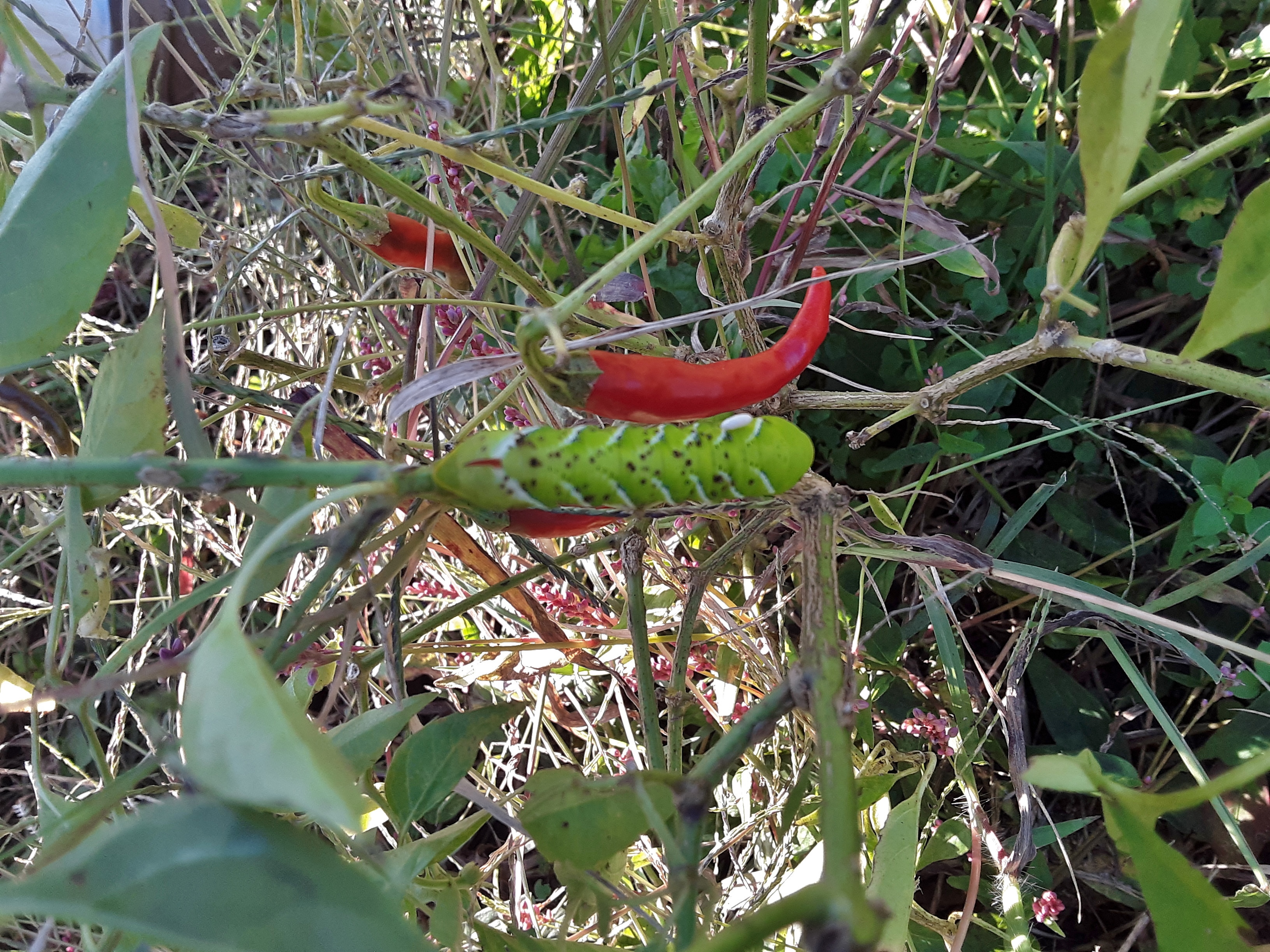 Who knew that anything ate Cayenne peppers. Tobacco Hornworms do. (My daughter looked it up first.) The seven white V-shaped markings and red horn confirm the ID.