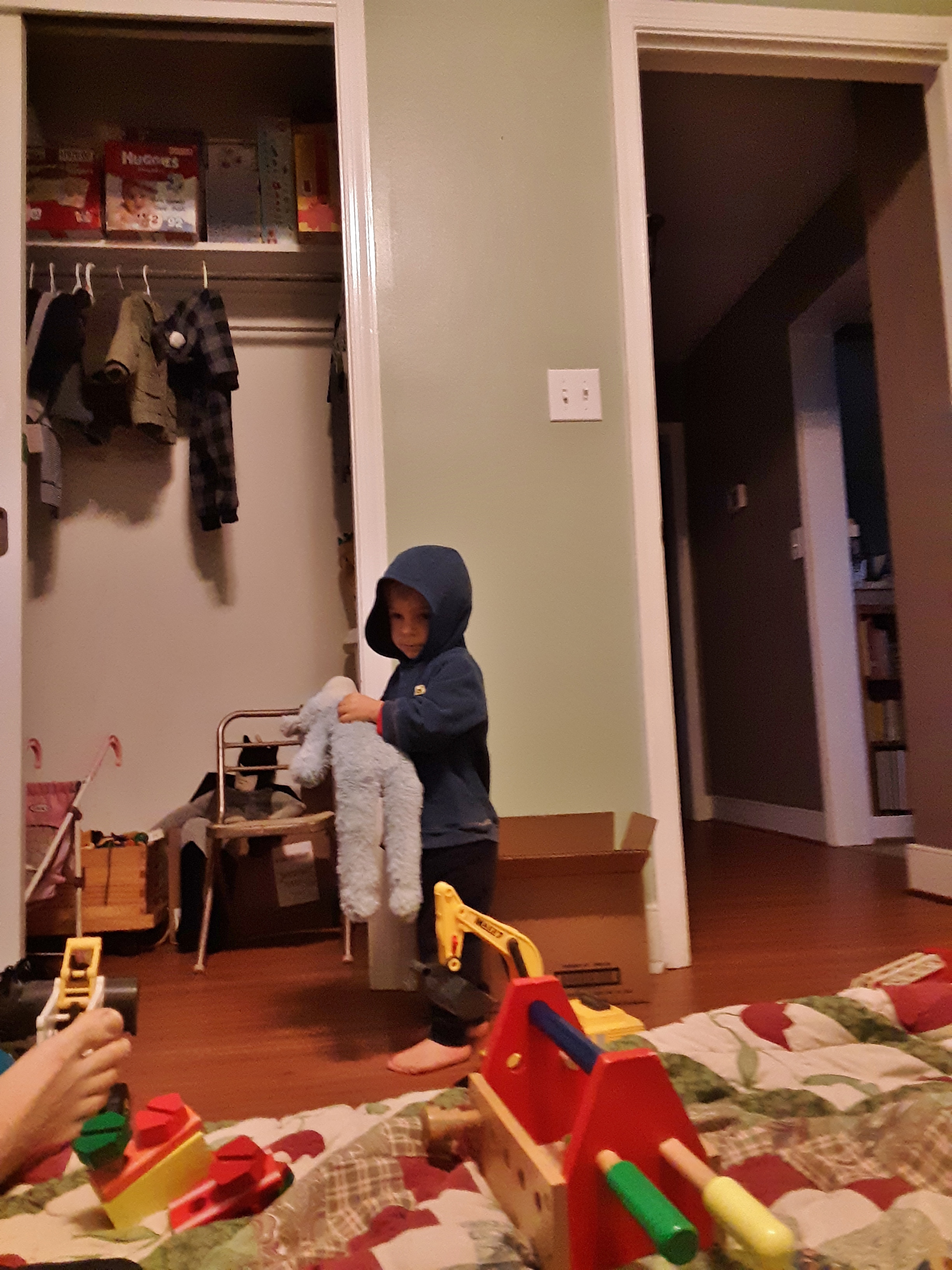 I guess the hood warms his head and the bear warms his heart. But what warms his feet?