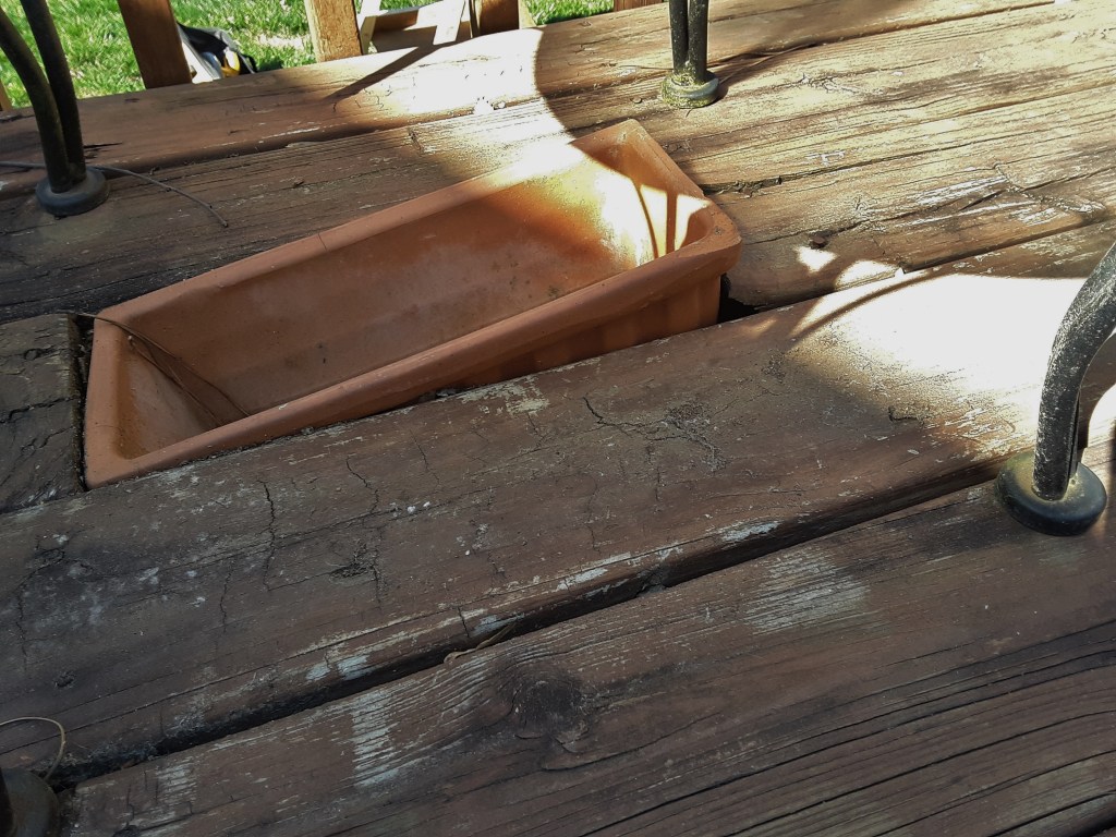 I thought that it was quite creative to but a planter pot in the hole and under a table until the hole could be fixed.