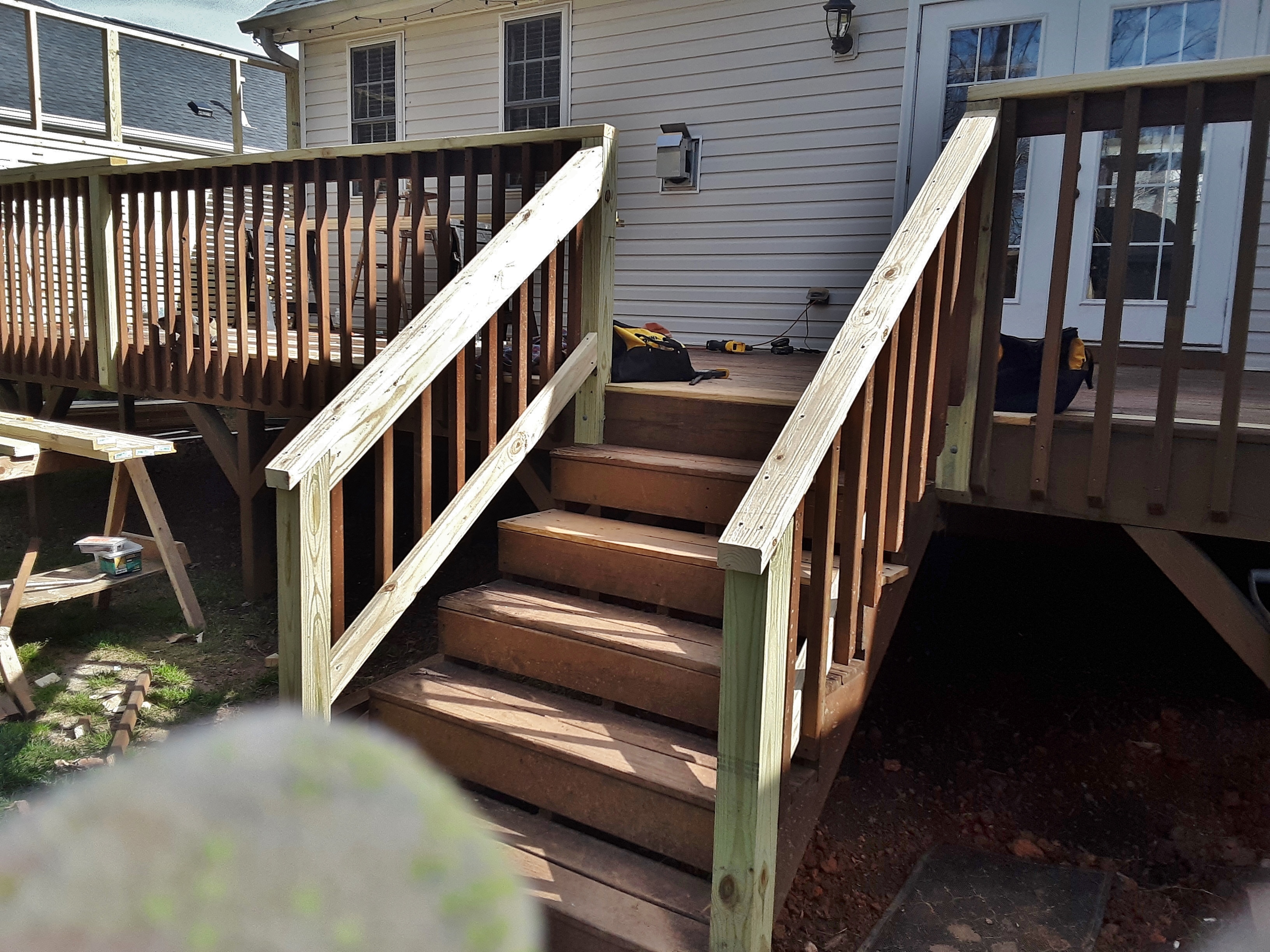 The new stair railing bottom posts are planted two feet in the ground, painted with tar, and concreted in. The railing is solid. The old balusters were fine and reusable, which saved more cost in re-cutting than materials.