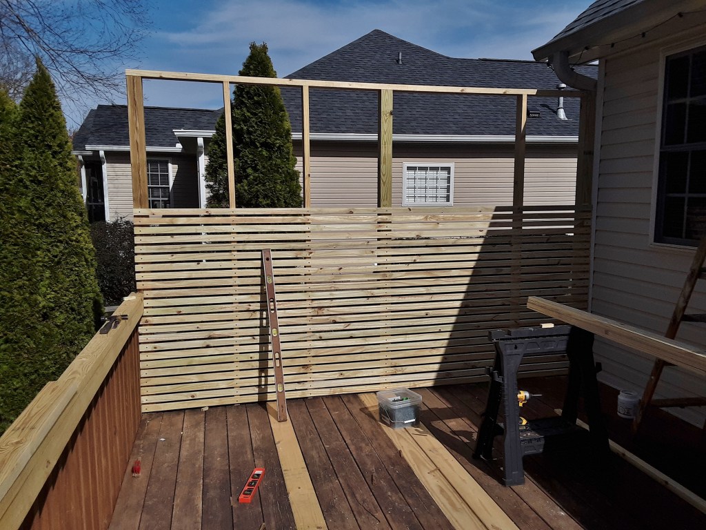 The owners also wanted a privacy fence and specified the height. I set three 4 x 4’s in concrete and bolted them to the deck. The slat boards were 1 x 4’s ripped on a table saw, meaning they were 1 11/16″ wide. (2) I might have built with wider boards but the owner had a certain aesthetic in mind. Notice additionally that I have begun the framing for the skirt to keep the dog and other critters out.