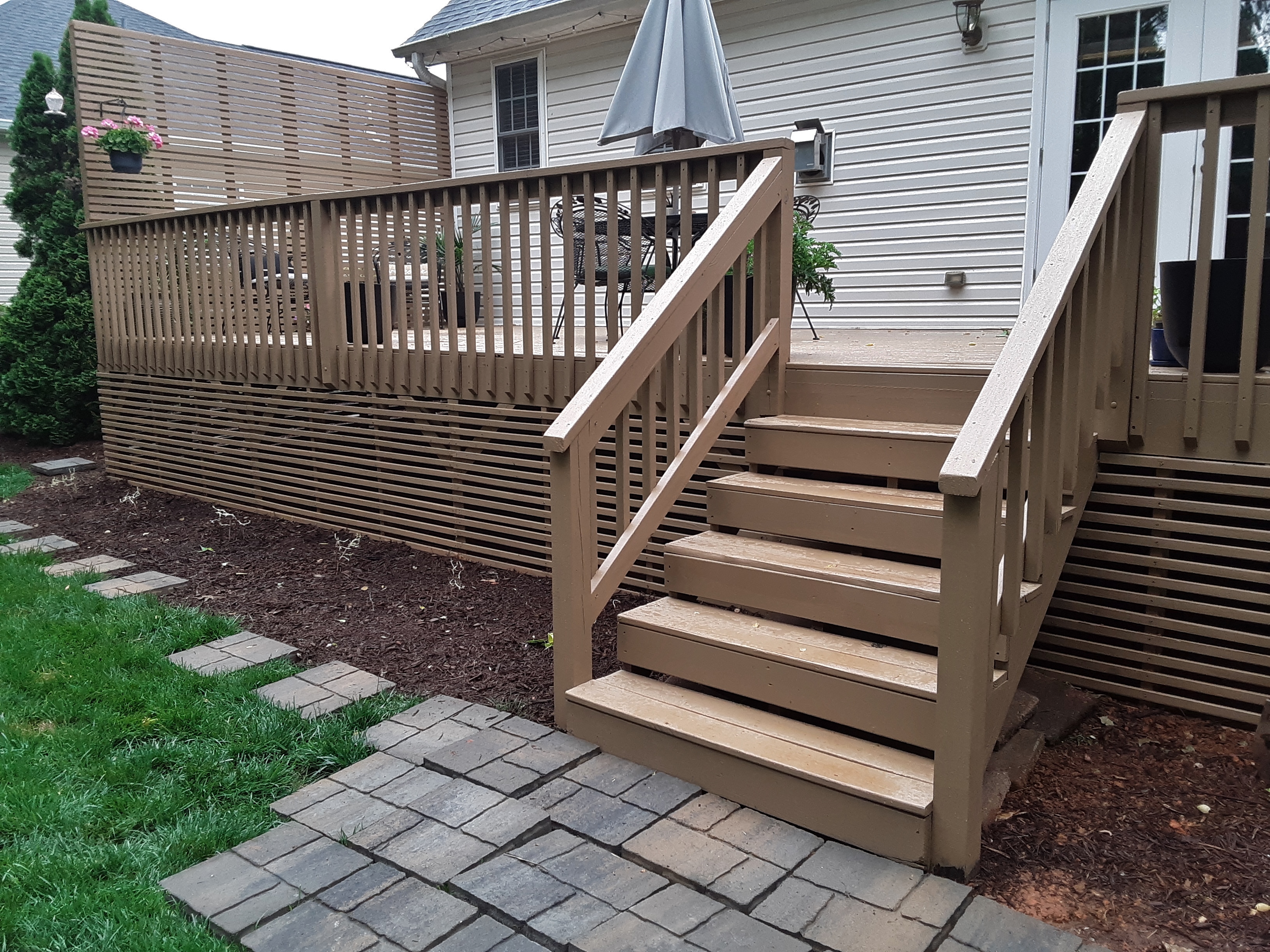 Following are the results of the repair. Given time restraints I did not stain the balusters or skirt. The owners did. I like their taste in decor and stain color. To save the lawn and prevent wet or muddy feet, they also added stepping stones.