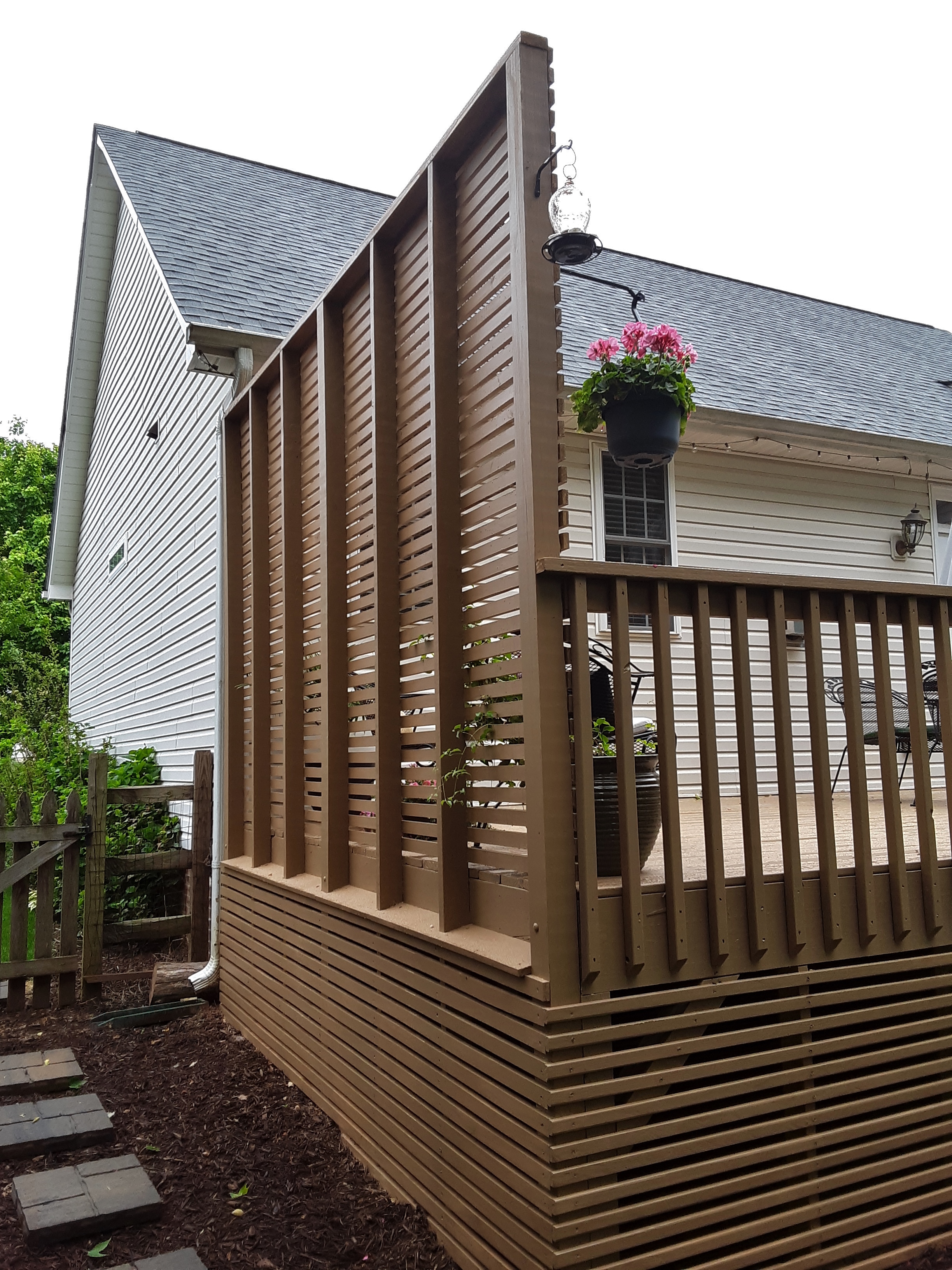 In two respects I had to be creative concerning the skirting. One was the transition from privacy fence to skirt. I opted for a water shedding wood ‘shingle’ that encased the uprights. The other is not pictured, a screwed in access ‘gate’ at the other end of the deck. If I hadn’t told you, you would never know it is there from looking. You never know when someone might throw or drop any number of things that go through the slats and need to be retrieved or some maintenance needed on the house that requires access under the deck.