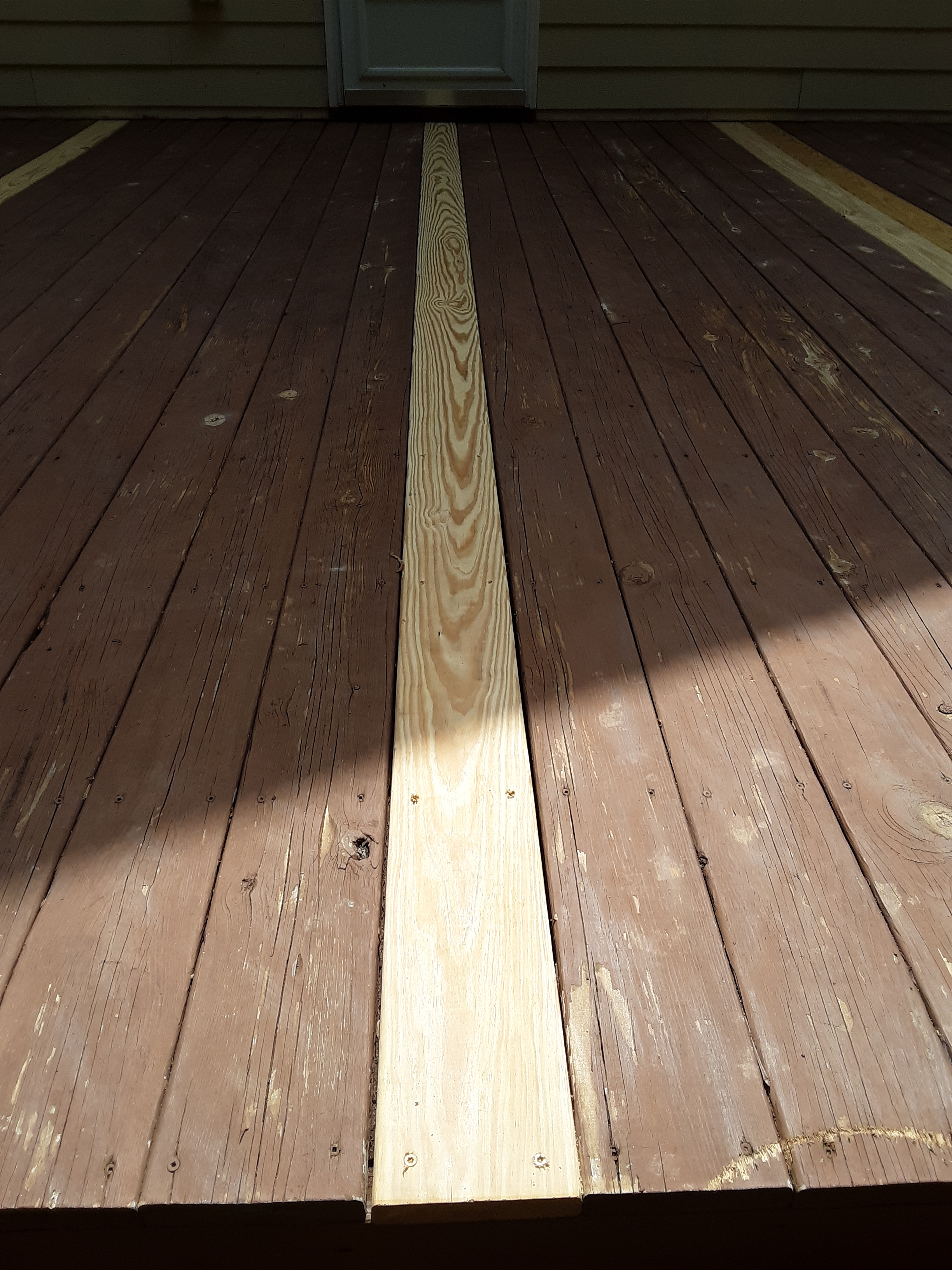 The owner requested that I pressure wash the deck before repair and restaining and provided a pressure washer borrowed from a friend at church. The deck had not been stained in five years, a time well within the stain can’s recommendations and “guarantees”, but the elements know no such time scales. This deck is close enough to trees, though not overhung by them, to get their leaf litter, catkins in Spring, and Yellow Poplar samaras. These get down between the decking boards and collect moisture, fungi, and bacteria (read “rot”). Particularly on this deck the gap between boards was not sufficient to allow this detritus to fall through, so it collected. You can see from the picture that the stain acted more like paint, clinging only to the surface and peeling when pressure washed. That is not good and may have been a large part of the deterioration. I would not have thought much of which deck treatment to use before I started repairing them, but I have some strong opinions now.