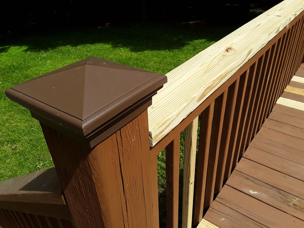 The caps are plastic and functional and I had to replace only two top rails and two balusters.