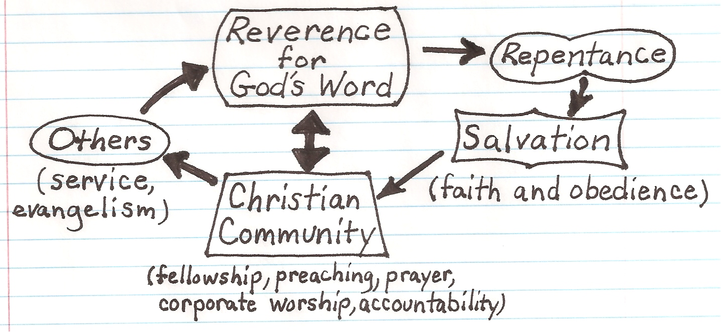 On page 126 of the “Gospel Project” lesson 13 for Fall 2012 Christian George discusses the connection between the centrality of God’s Word and Christian Community, that is, “Scripture is the basis of true community”. Words are good but for my mind understanding and memory are better had by diagrams. So here is this week’s unravelling of interrelationships: (the arrows should be read as “leads to”)