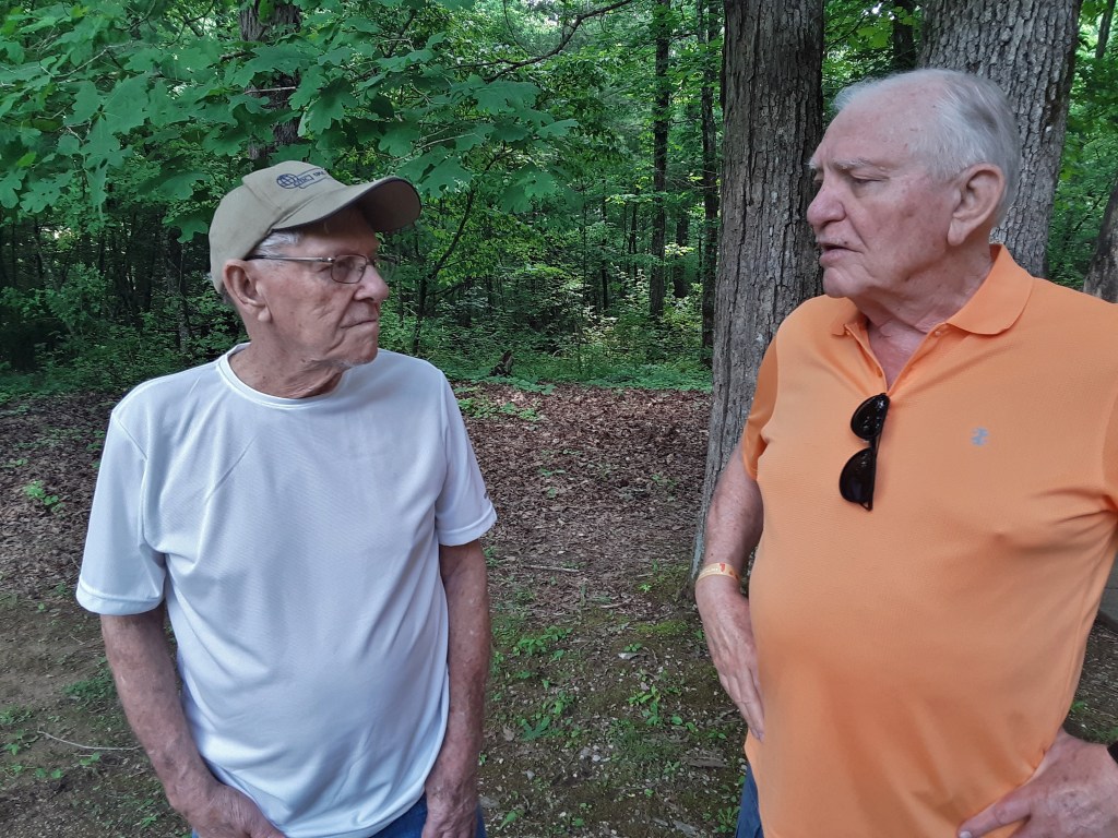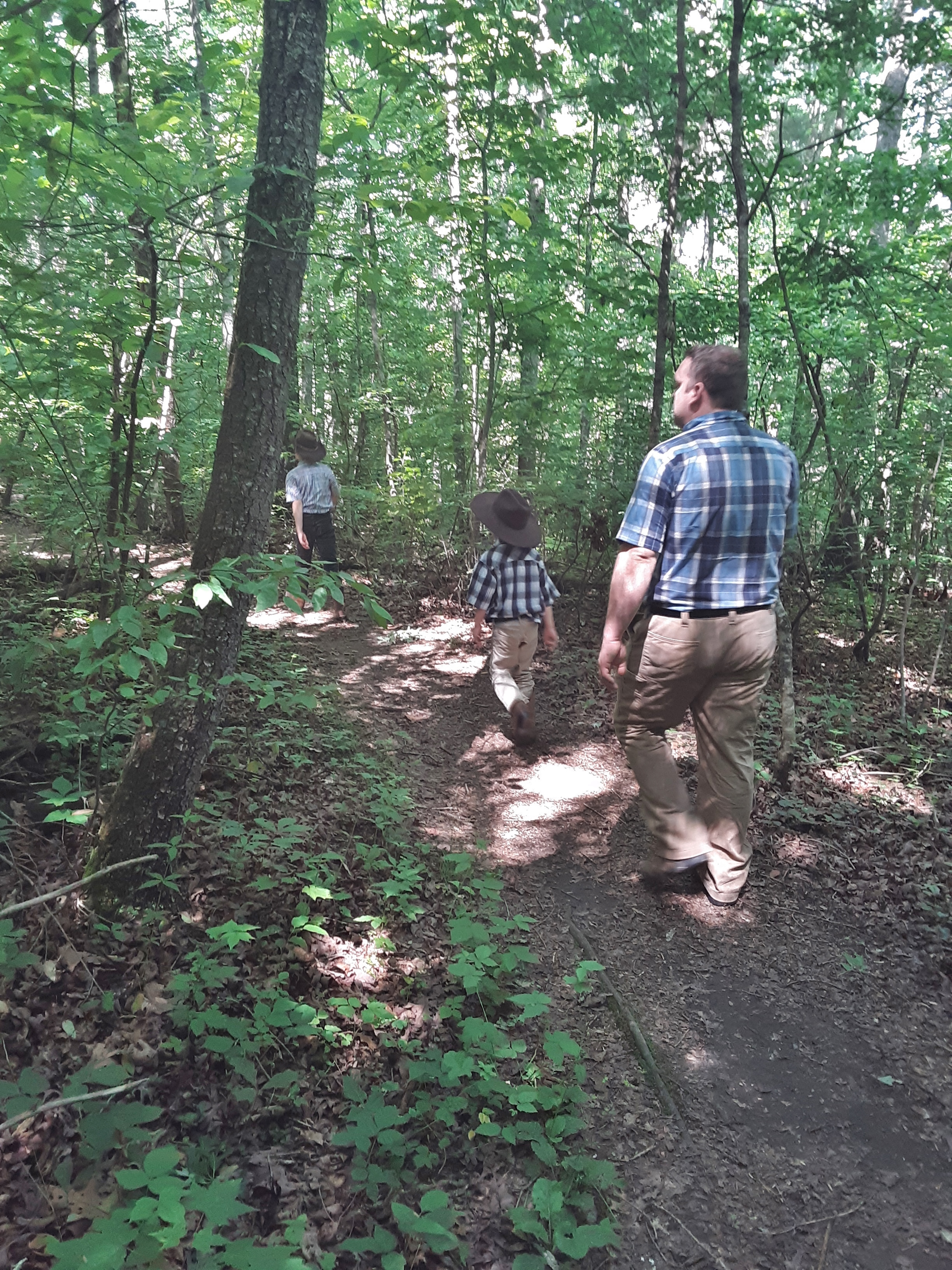 My two oldest grandsons and their father rode with us to the reunion. The others stayed back for a much needed nap. We had gone on a hike together previously, so they wanted to go again. We went down the road a short distance to the dam where we found a trail down by the creek.