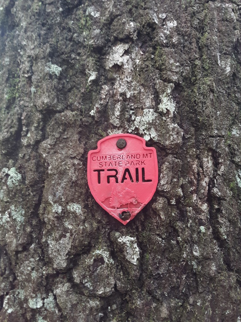 Besides painted dots to mark trails, the park has these special trail markers, this one on Black Oak bark.