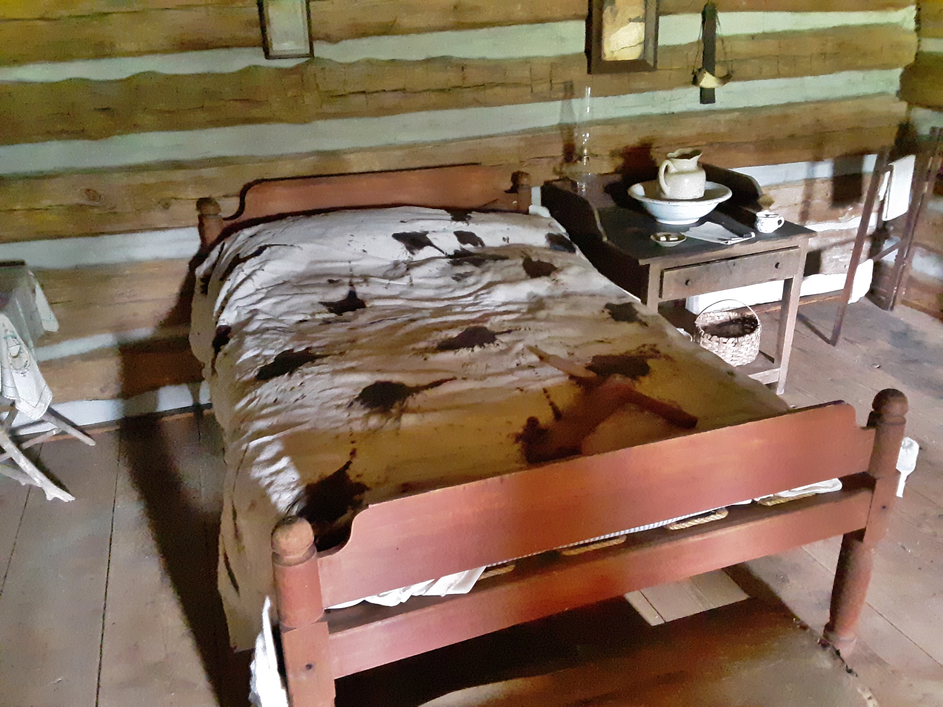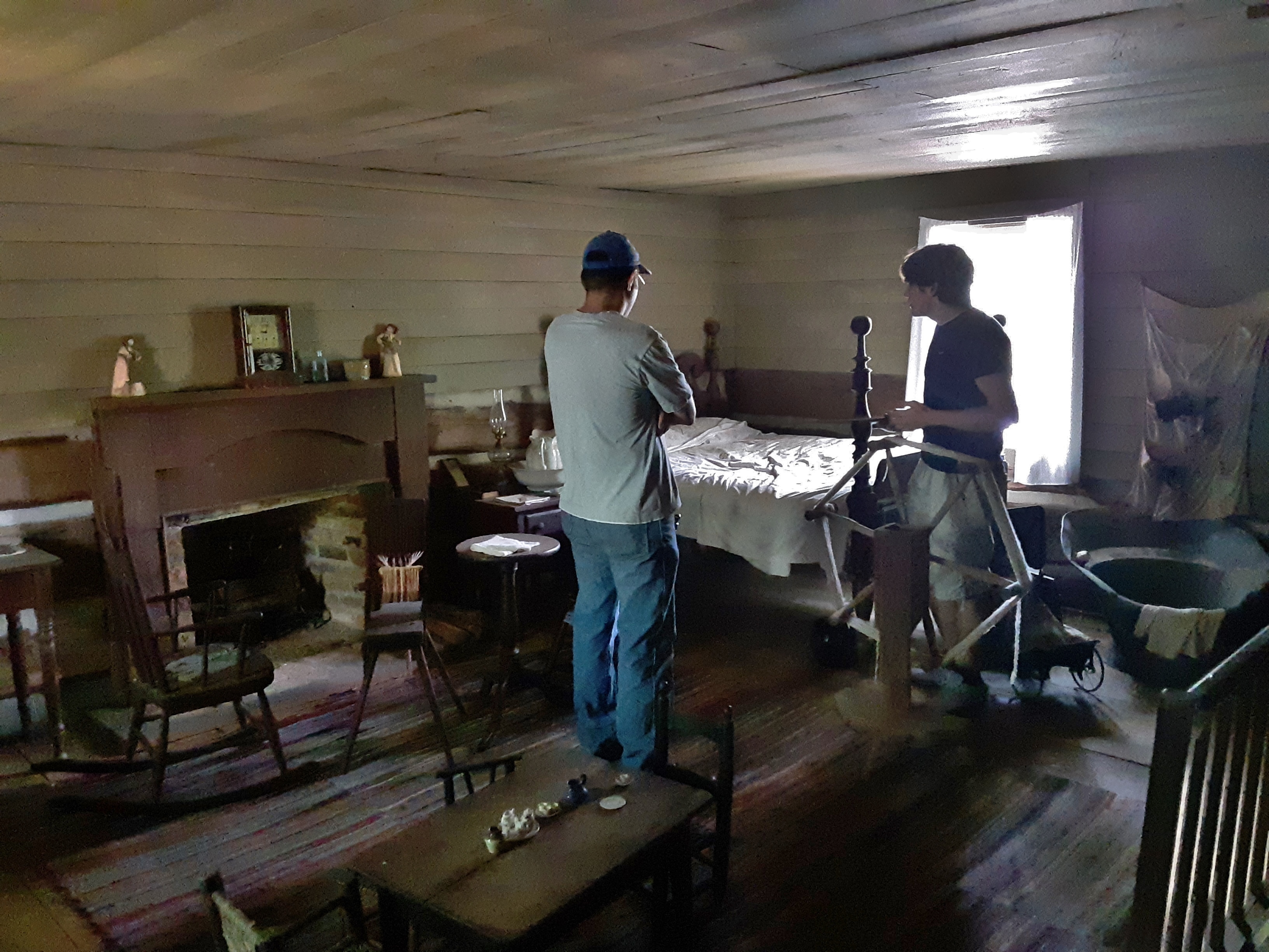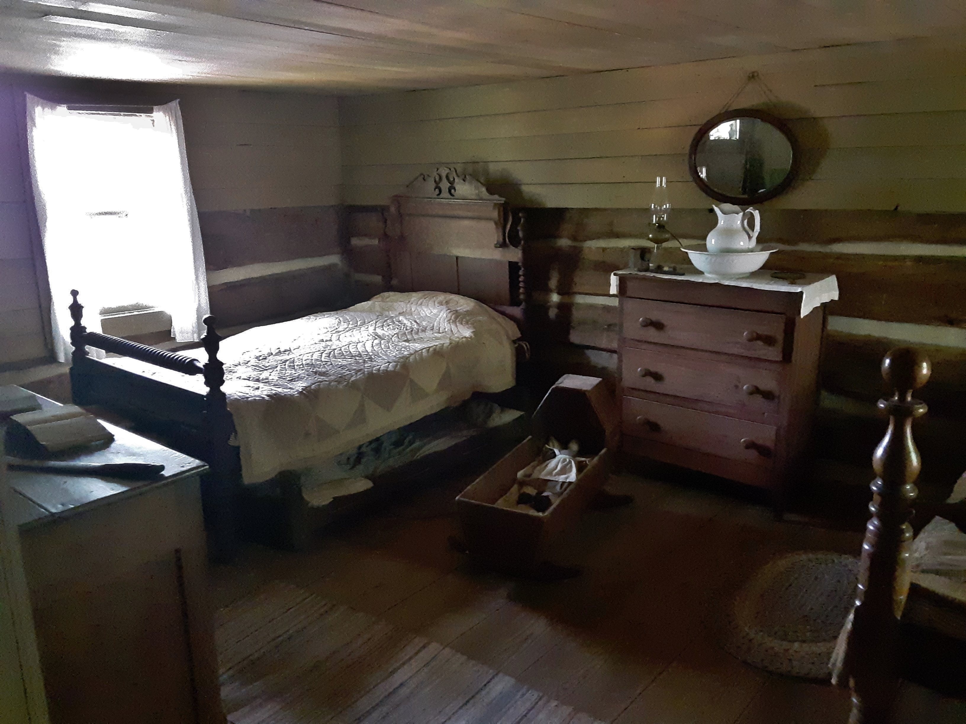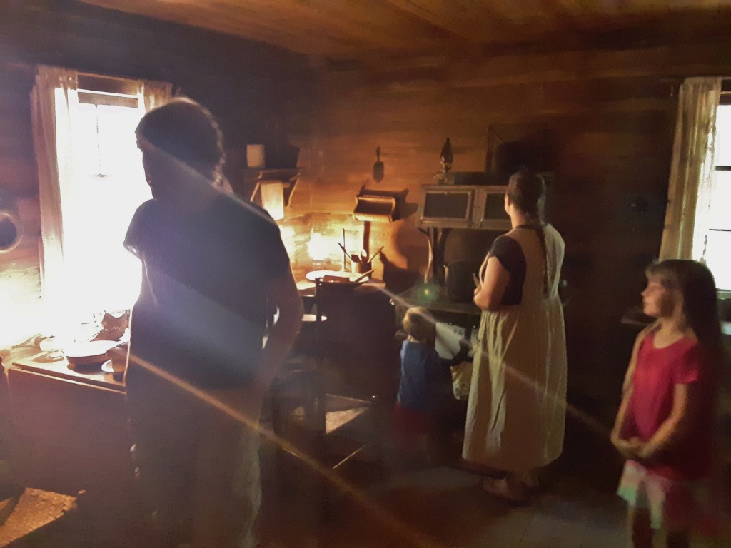 The young and energetic CEO passed us off to the young, talkative, and knowledgeable tour guide. He has lived on the premises as son to the caretaker for ten years and has been involved in deconstructing, moving, and reassembling several of the historic structures as well as repairing and upgrading others constantly. Here he is (on the right) in an upstairs bedroom of one of the larger log cabins describing the set-up to my son-in-law. Very few of the pieces of furniture were original with the cabins they are in, but they are all very much period pieces.