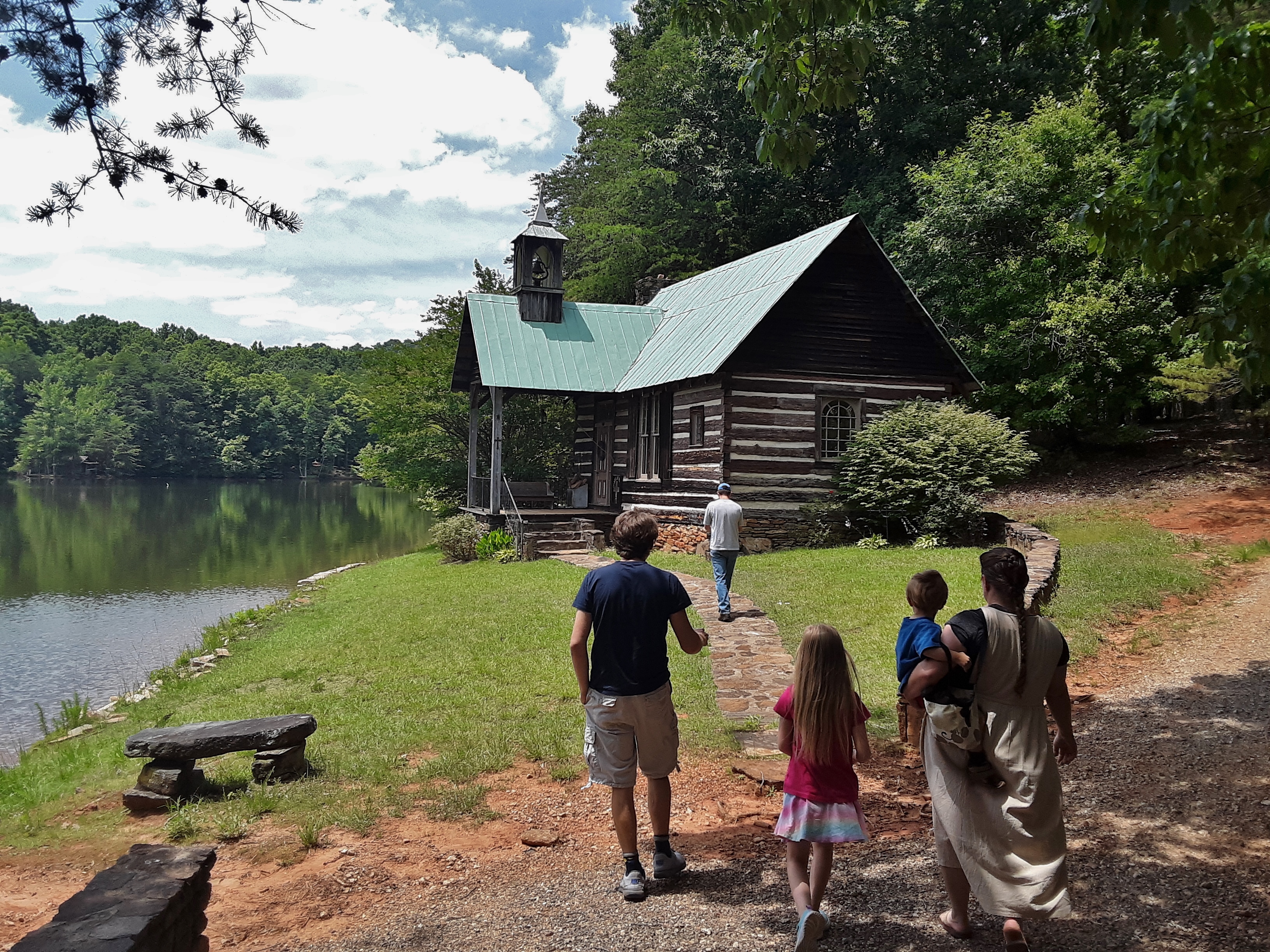 Our tour guide (from here on XS) said that there are now 103 and historic log structures on site, approximately 80 of which were log cabin homes. The structures range in construction date from 1792 to the 1870’s (the latter number being an observation of mine and not definite). Most were bought by the late Dr. Hart. XS said the property was originally intended to be a personal preserve for the good doctor but shifted purpose when a friend suggested a log cabin be purchased and moved to the edge of the pond and then a barn. Two of the most fascinating and used structures are the log churches. You might well imagine that some couples would want to be married in these rustic and romantic houses of worship.