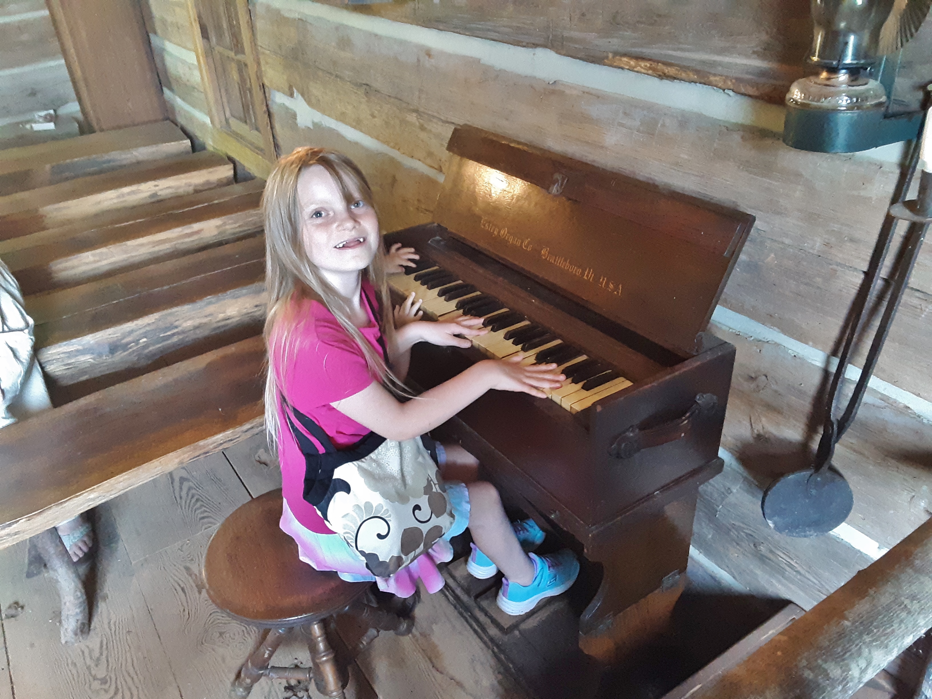The other church is smaller and has a circuit rider’s portable pump organ that could be folded and strapped behind the saddle of the traveling preacher. My grand-daughter pretends to be the organist on this day. I found an old hymnbook on the podium and began leafing though it. I think myself somewhat knowledgeable in Christian hymnody, but I had gone 50 hymns before I found one I knew. I sang the first verse. It seems an apt response to being in a structure constructed and dedicated to the worship of God.