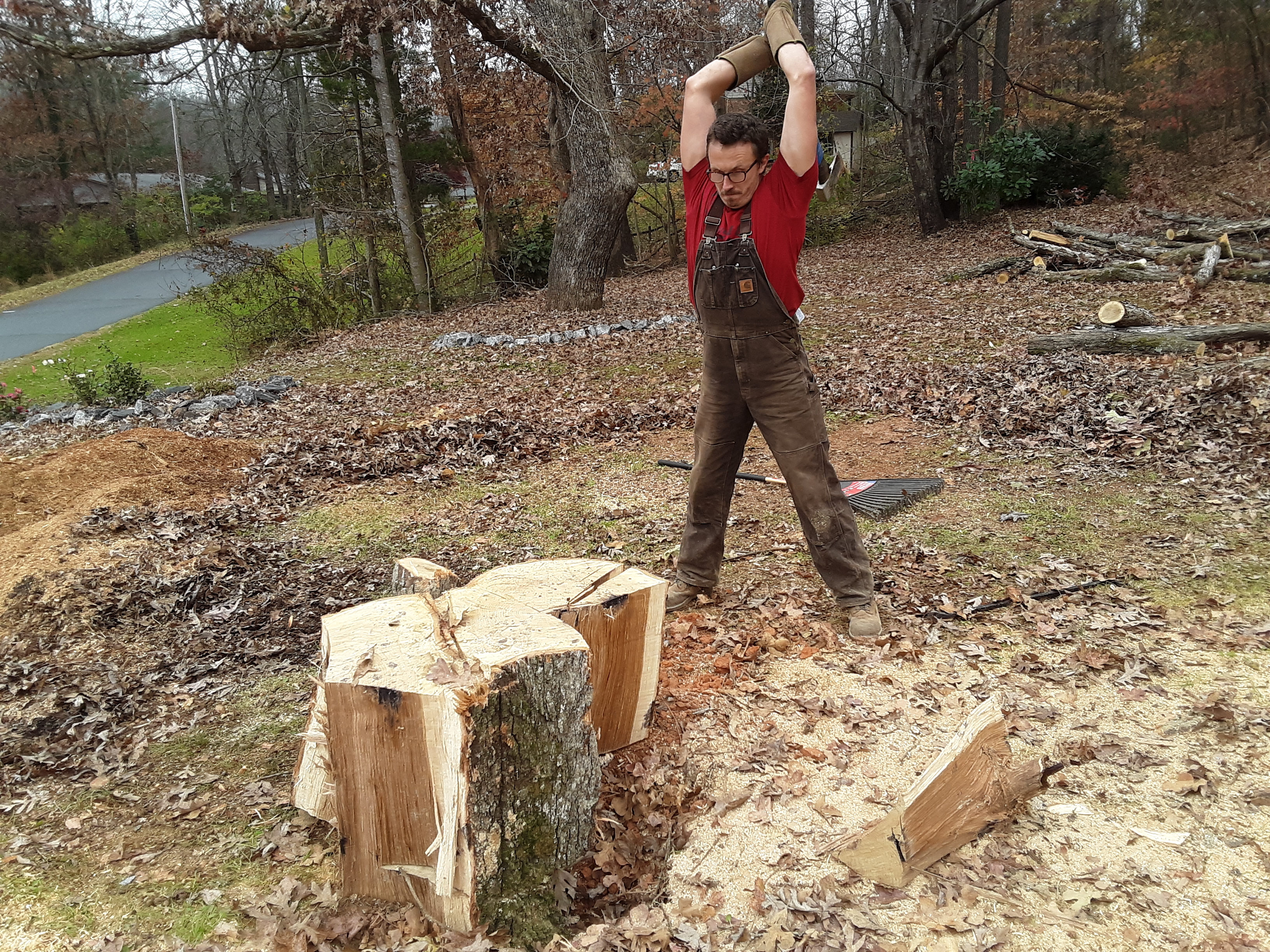 I love this next picture. It shows my friend’s determination, focus and strength. He was amazed at the first decently large piece that I split cleanly with an axe. I felt like I had done a Hollywood stunt*** and quickly explained that I was able to do that because it was so straight grained. These pieces are the joy and fun of splitting wood before the real work commences.