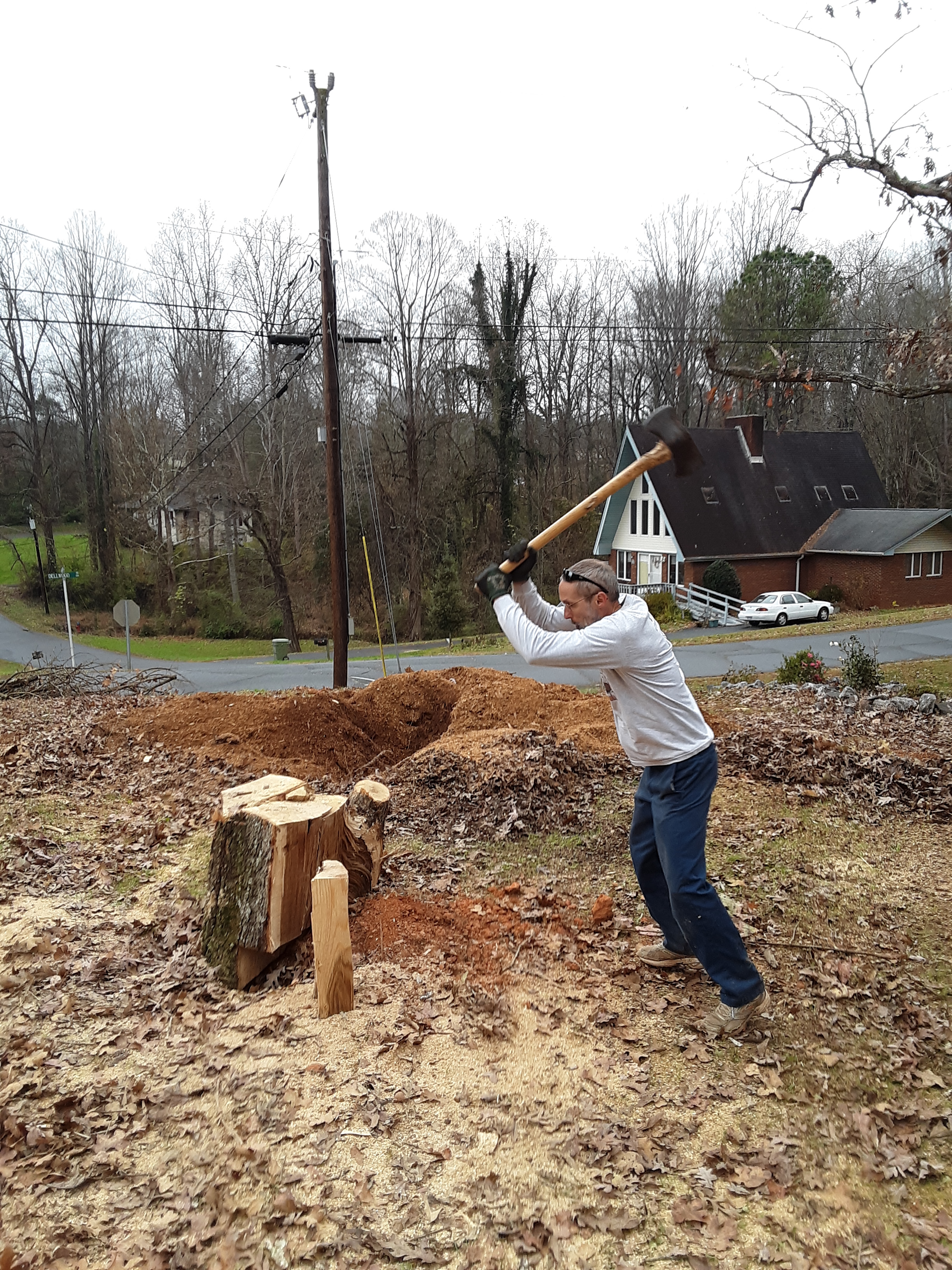 It is amazing how fast the wood can pop sometimes. The piece has flown off to his right before his axe hit the ground. He learned something else this day. Though plastic handled axes and sledgehammers have the advantage of being hard to break, the handle pounds the daylights out of your arms all the way up. I swung his axe a few times and then went over to get my wooden handled axe for the remainder, as you see above.
