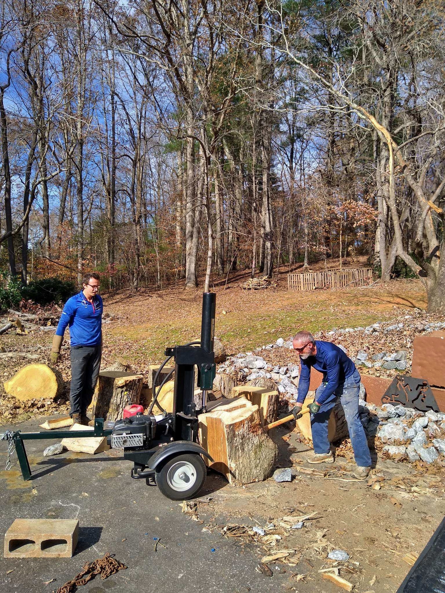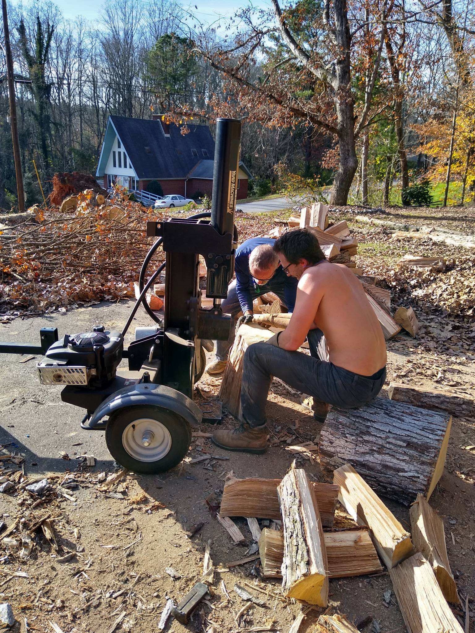 We split wood for more than six hours. The claim and assumption is that a hydraulic wood splitter takes all of the work out of splitting wood. It most definitely makes it easier and splits twisted and forked pieces that are hard to do manually, but it does not remove all work. And, there are pieces that can only be done with sledgehammer and multiple wedges. Following I have two sequences of the splitting process. The observant viewer would figure out that these are not actually sequential pictures, but ordered from various images to show the process. Most of the work of hydraulic wood splitting is getting the log under the wedge.