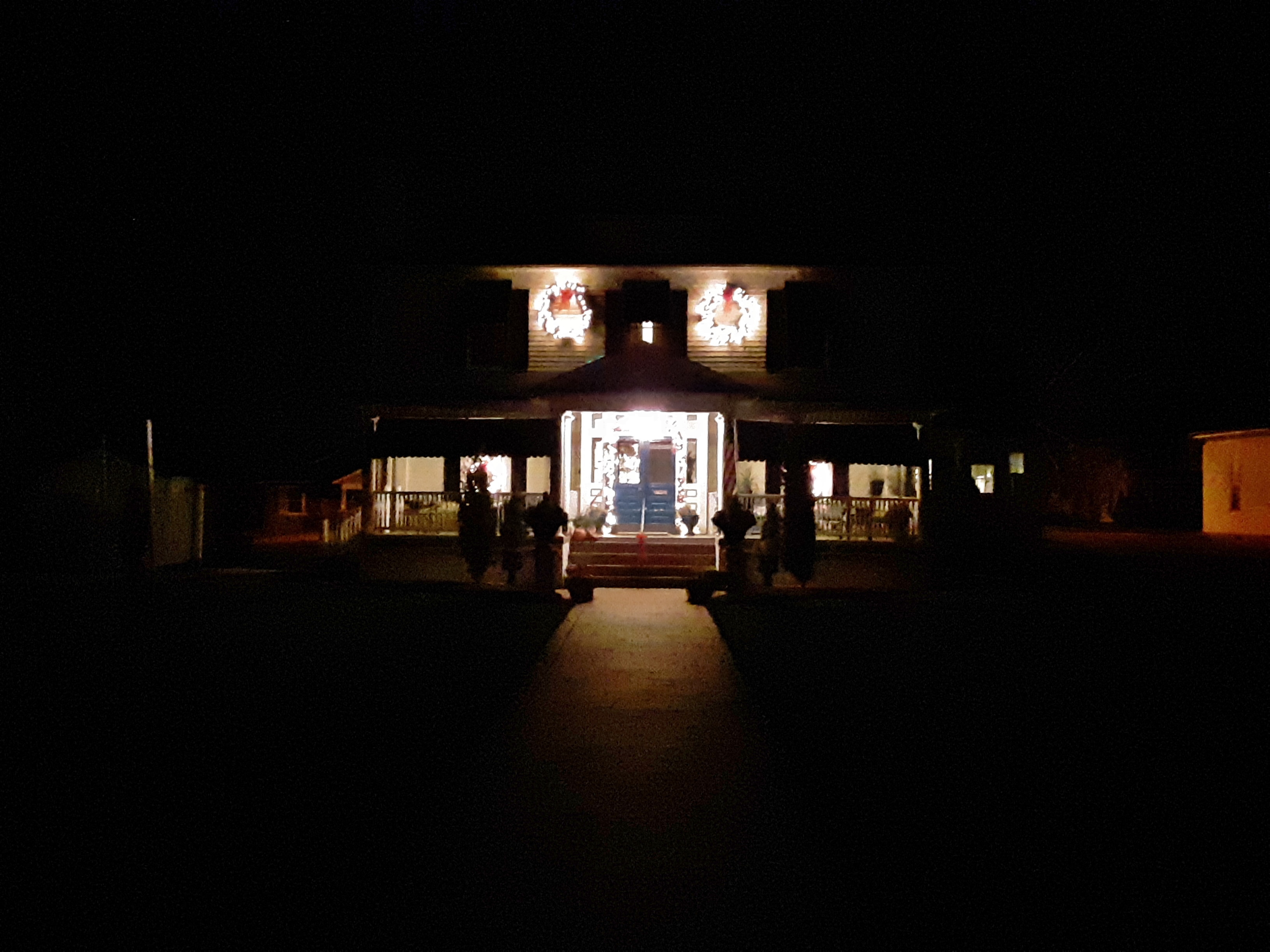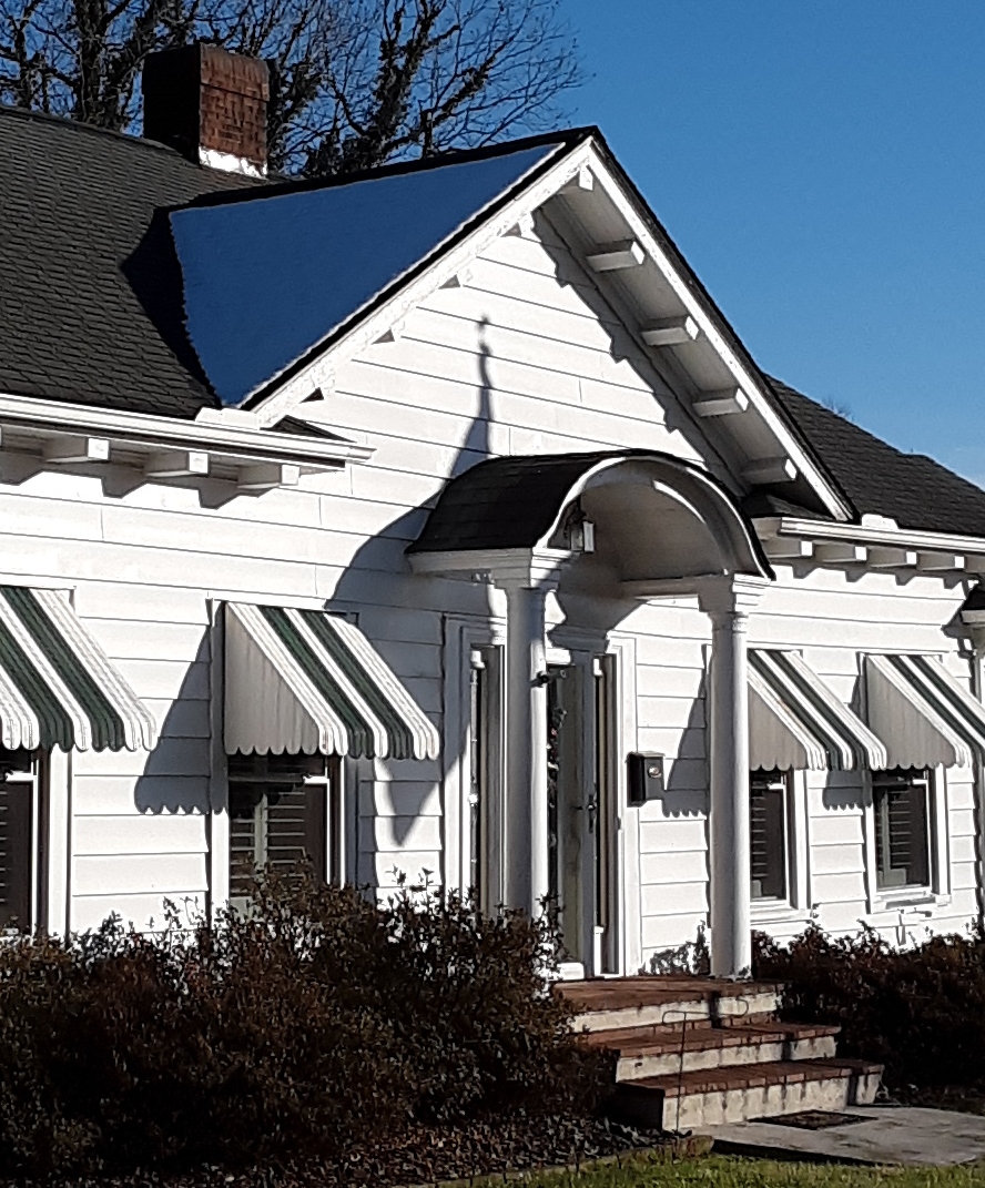 I took this picture for three reasons. Firstly, you can see that the hour is past midday and the low angle winter sun never shown on the heldover snow. Secondly, the front porch canopy is unique and nice. Thirdly, the old fashion window awnings are a Southern touch to keep out the hot summer sun.