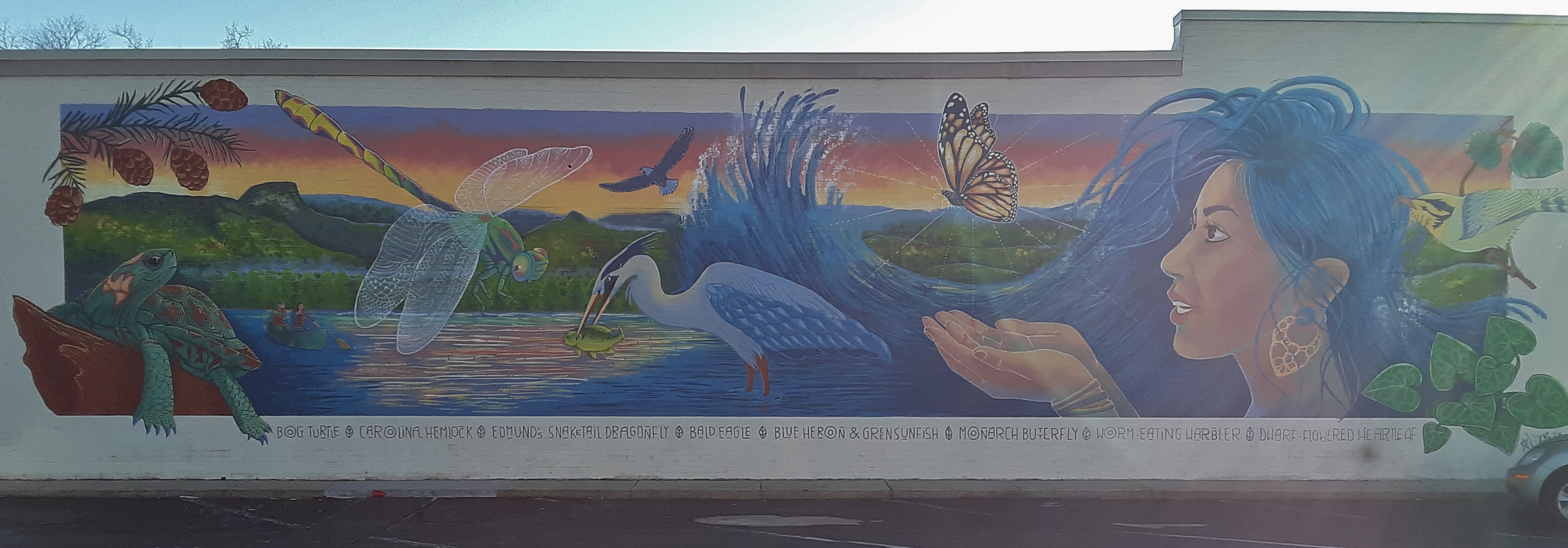 In order to highlight our town’s diversity, the local business commissioned this mural on the side of the local climbing gym. I shows a very Latin American woman in a very Western North Carolina habitat.