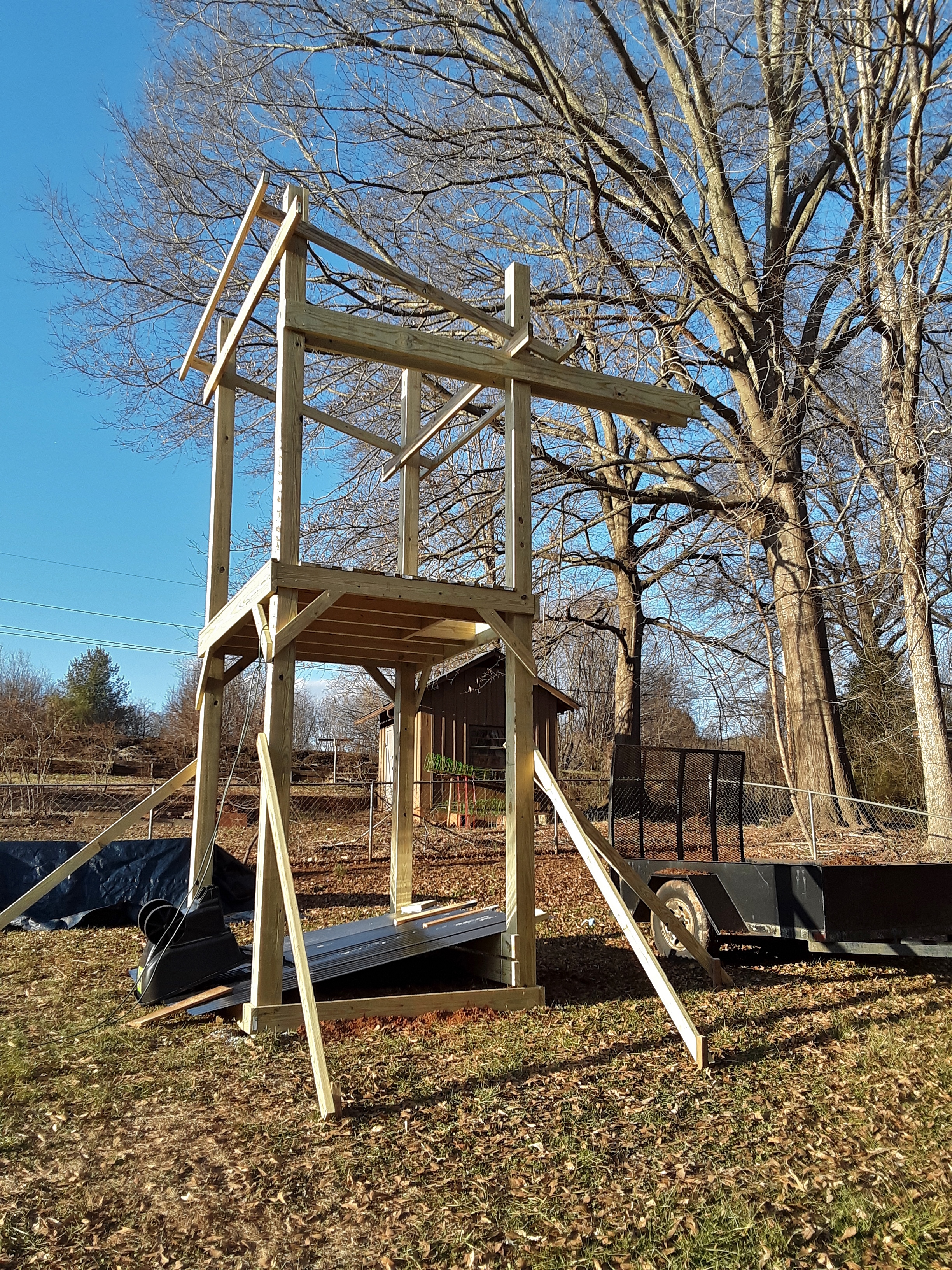 The double 2 x 8’s hanging 5′ off of the back will support an aerial silk. S, who is the ten year old girl this is being built for, is taking lessons.