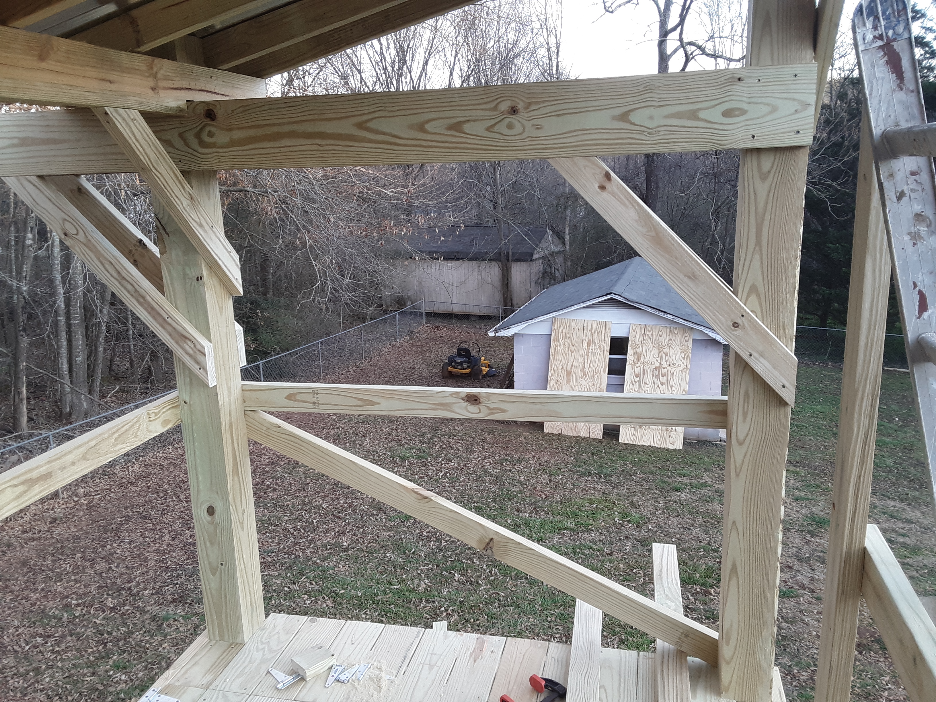 We are along about day 8 so I will sign off for now. Another day I will show more progress on this cool playhouse. If you are interested in a playset, climbing wall, deck, and any number of other wood projects contact me through my facebook page, ww.facebook.com/decksandsuch