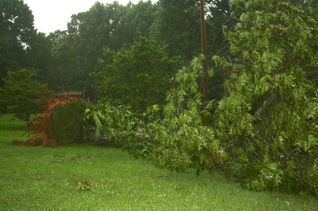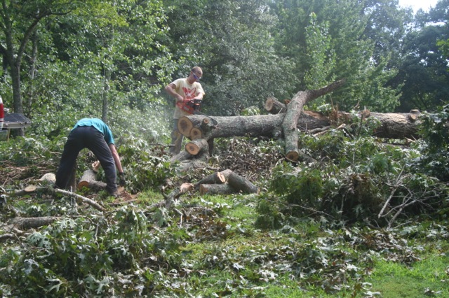 The rain and storms have been relentless this summer in North Carolina. Our neighboring town received 12 inches of rain in six hours today. Roads and bridges were washed out and homes flooded. Thankfully there have not been too many severe wind events, but a friend of ours and a few of his neighbors experienced a microburst which fell six trees in their yard. My fiancée and I were in a microburst on a summer day in 1981 while making applebutter in a 30 gallon copper kettle over a fire. It mowed 18″ yellow poplar trunks off half way up that stood in the next door neighbor’s yard. This present event, however, worked with the additional help of month-long saturating rains so that every tree uprooted. Two were healthy two foot diameter red oaks without the typical rotten tap root and hollow trunk. I went to help and give additional training to my sons in chainsaw use. They are conscientious but a father wants to protect his investments. Few chores work you quite so hard or give quite so much satisfaction of accomplishment as cutting and clearing trees. There were as many as four chainsaws going at once, which is a concern, but everyone acted with more than adequate caution both sawing and hauling. It is good to work in tandem with friends and fellow believers to help someone. I know where two truck loads of firewood went but there were probably 8+ to be had. The hydraulic splitter was due to come later in the week and finish the job.
