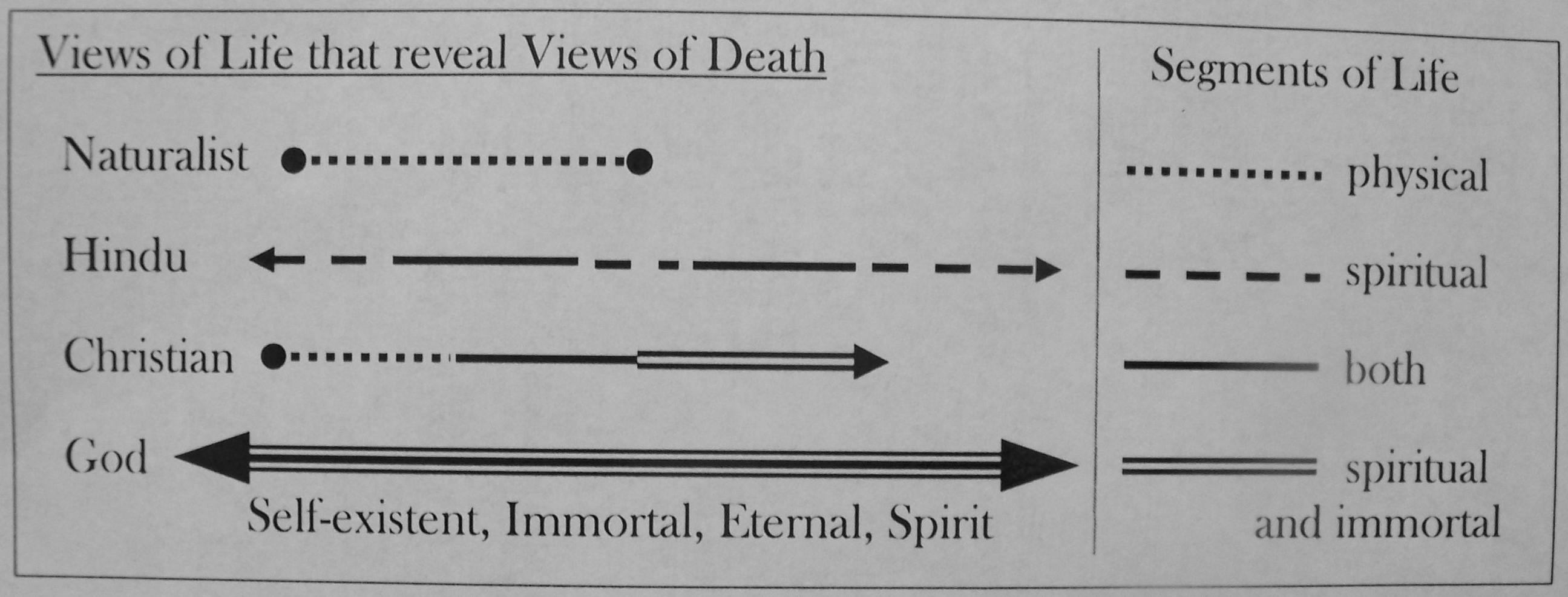 While considering this morbid study it occurred to me that one’s view of life overshadows one’s view of death. Our society has three major views of life I think. I have diagrammed them in the following figure. I add to the view of a Christian’s life that of the God of the Bible.