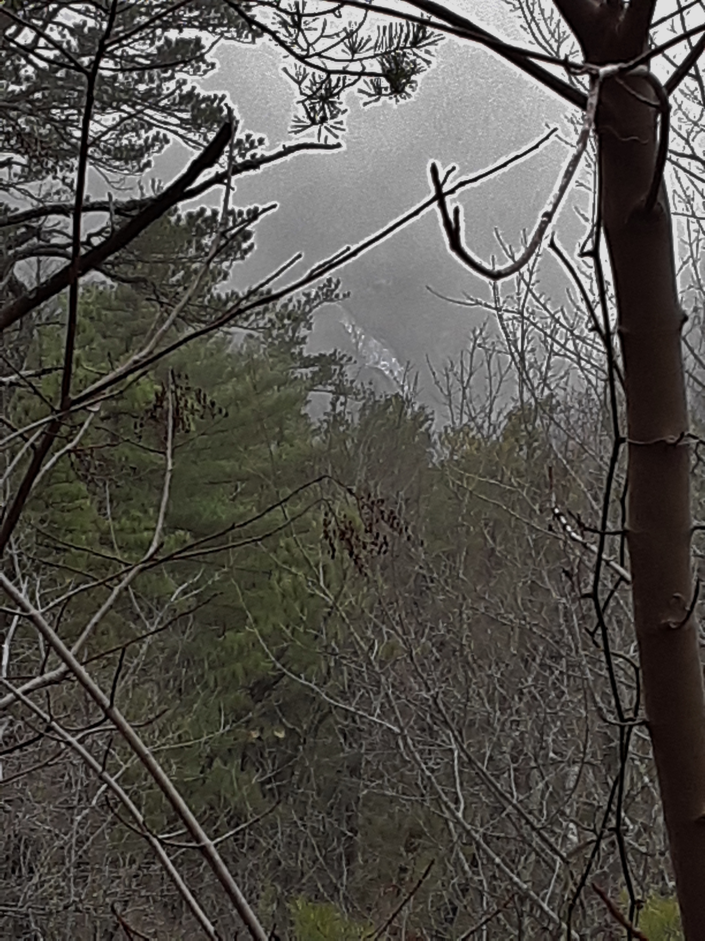For a change of pace we did the usual trail to the falls backwards, hiking up the long, steep, old logging road to a point above the falls. On the way up there is one small view of the waterfall, which was further obscured by fog this day. The backlighting of the fog caused outlines around twigs in the following picture- odd.
