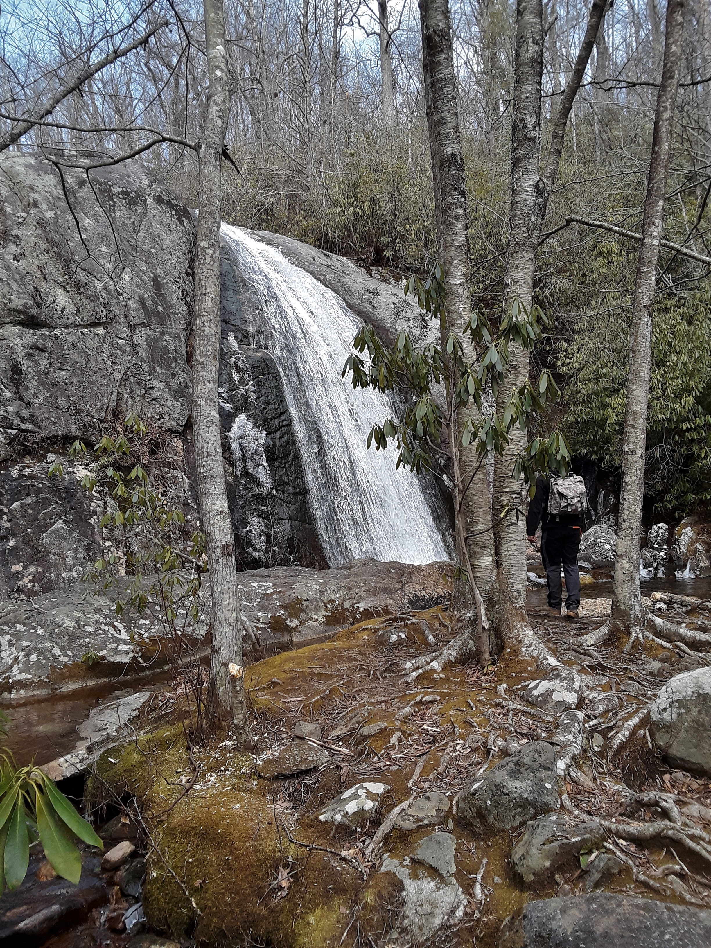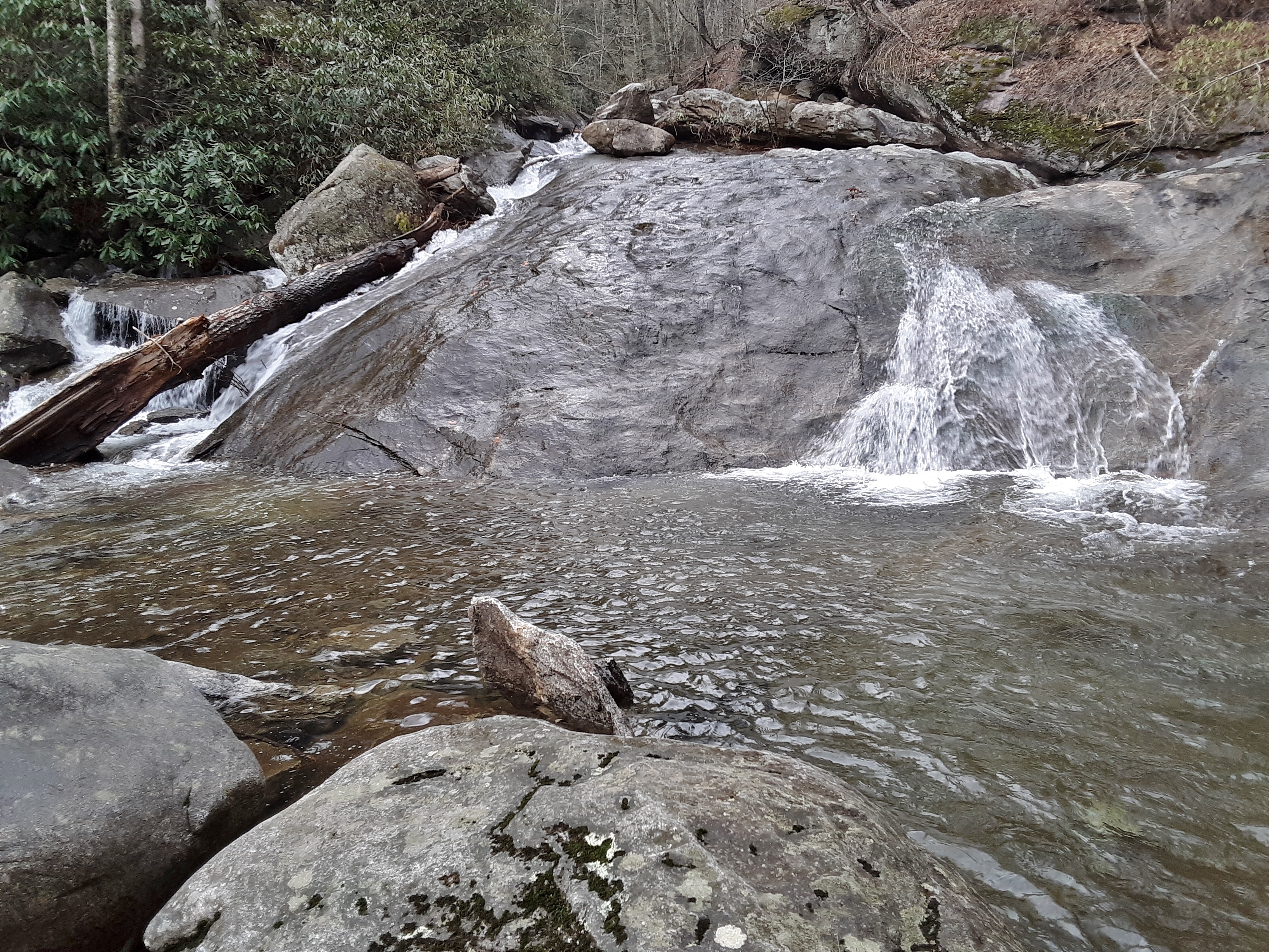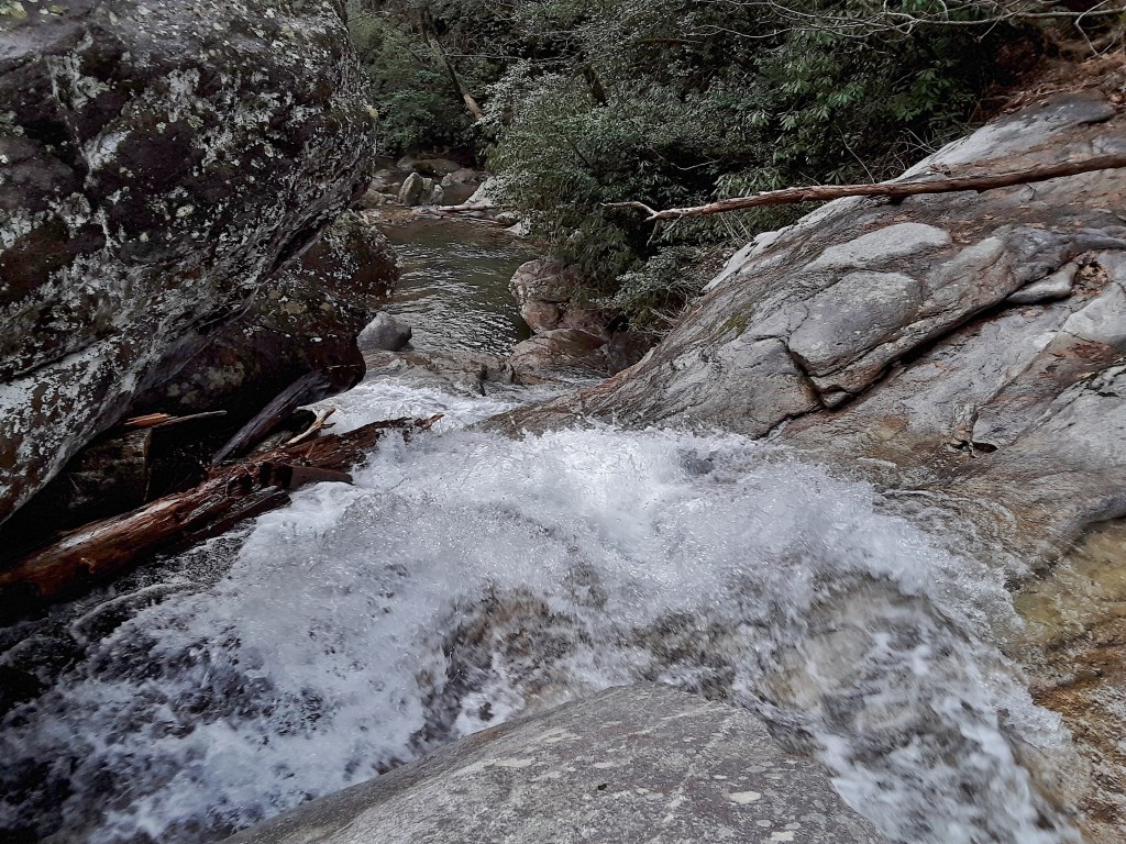 North Harper Creek Falls runs down perhaps 150 yards of 30 degree sloped rock outcropping to then fall over a 25′ cliff at the bottom. It occurred to me that the water slips into the pool and makes far less noise than most falls. The picture shows moderate flow for this falls.