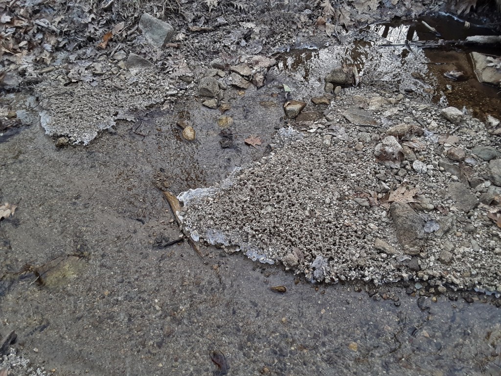 Frozen gravel is an odd sight. The air spaces created by the expanding ice make it quite crunchy to step on.