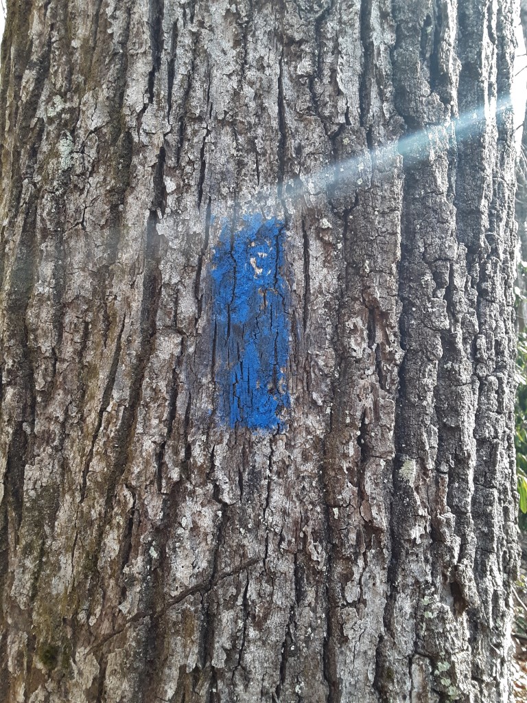 Which trail are we on? The color of the blaze tells you. The sunbeam across this Mockernut Hickory bark gives the blaze an extra apparent significance. It makes me sad to see when someone slashes at a tree. the damage to the bark can introduce disease or allow entrance by insects.