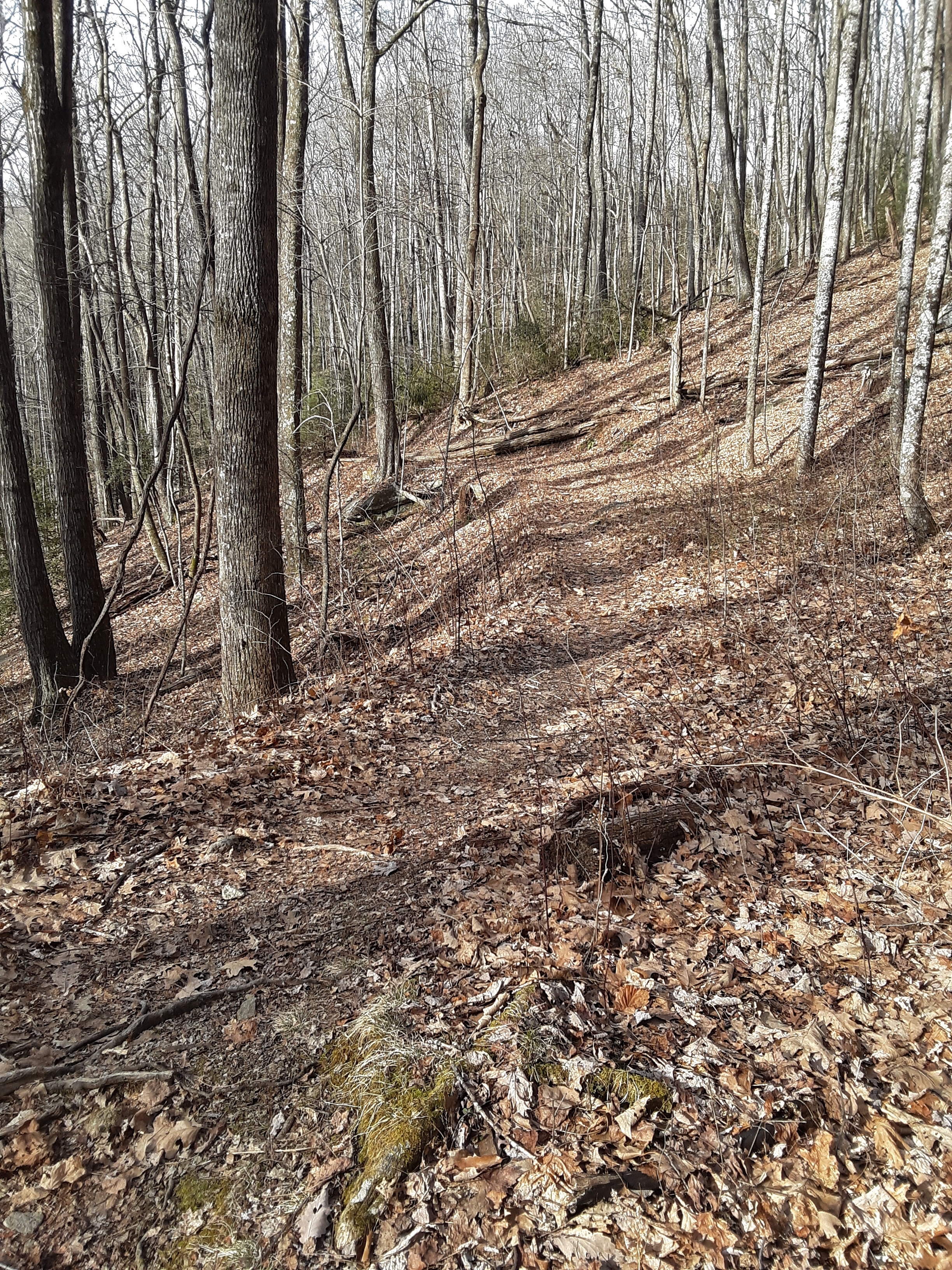 Early in the hike as I was making a creek crossing, my left foot slipped on ice and plunged into the creek over the top of the boot. It could have been worse. No injury and nothing else got wet. I poured out the water and walked without a sock on my left foot for perhaps a mile. My heel began to tell me a blister was in my future, so I told my son that I would take him up on his offer to dry out my sock. We found a wide spot on the trail where there was totally bare, mineral soil. My son gathered small dead umbels (4) of flowers that he said are always dry even when it is raining. We both gathered leaves and twigs up to about thumb diameter. He got quite the hot little fire going and fed it while I rotated my sock near the base causing steam to rise from it. I have one regret concerning this blog entry. I was so intent on drying my sock that I never thought to take a picture of the fire. My son did do a thorough job of spreading the embers and stamping it out before we left. I crossed the creek at a different place on the way back.
