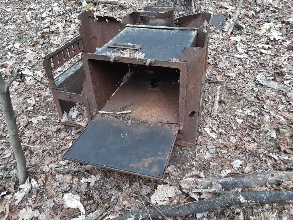 The old cookstove has seen better days. I had hopes that the nameplate was on the door, but someone had removed it long ago. It would have been cast-iron and not so deteriorated as the plate-steel guts of the stove.