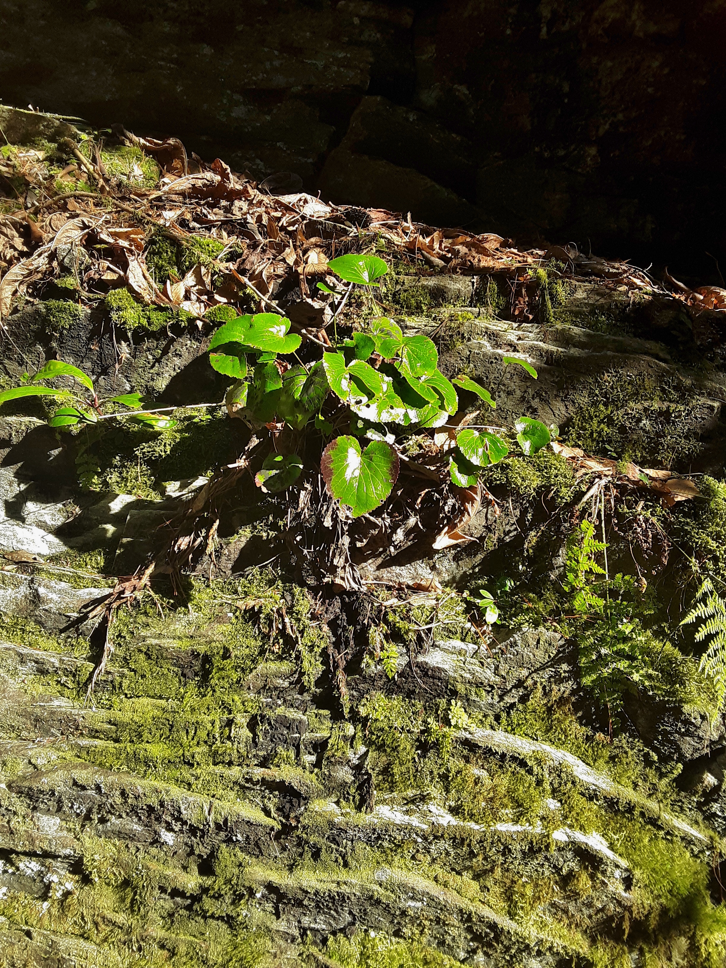 The splash zone of this waterfall and rapids below is quite large so there are plenty of Hornworts, Liverworts, Mosses, and Ferns. Check out the Doghobble at the right.