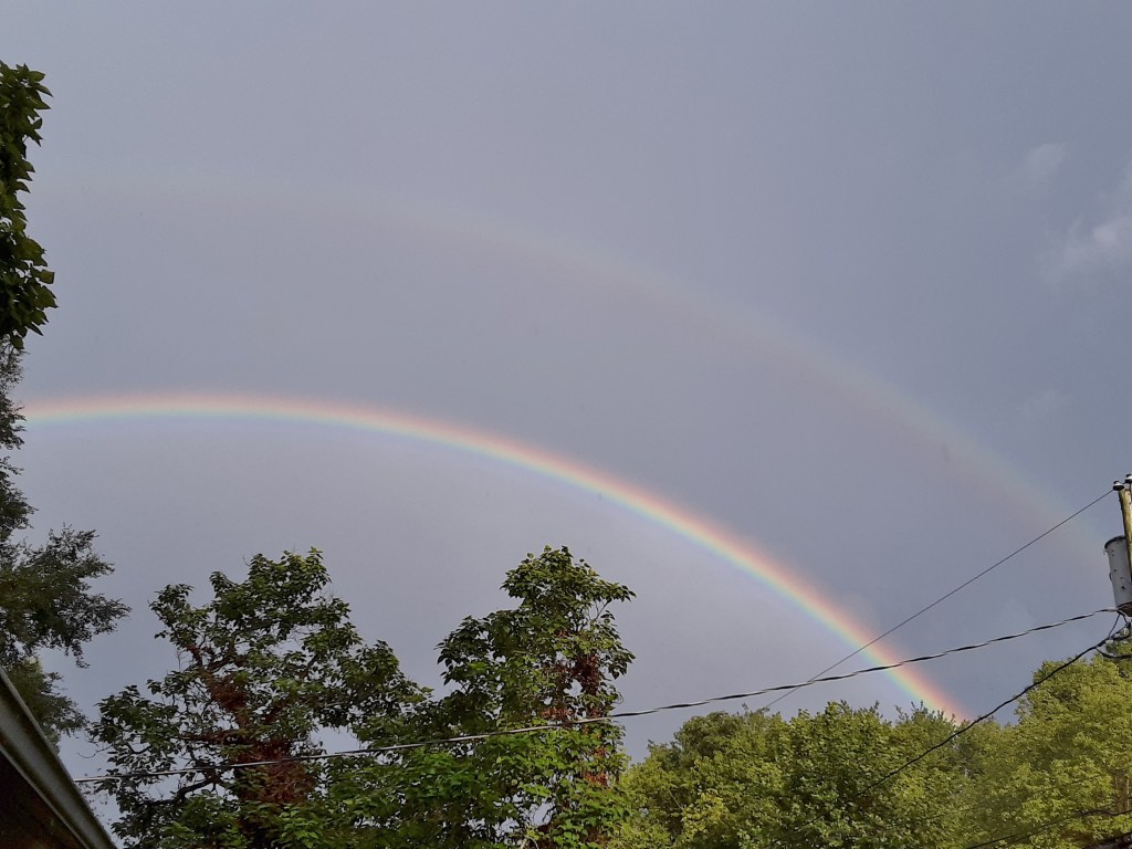 With all of the rain there are moments when one wonders how wet it may become and when it will end. But never fear, there is always the promise of sunshine tomorrow (Genesis 9:8-17). Have you ever noticed that double rainbows have the colors in opposite order? From the observer’s perspective the spherical prisms (aka raindrops) are refracting sunlight in two different directions from that point. Also, a rainbow dims as you travel down a highway because you are no longer at the optimal angle to see the most light. So, one of the two rainbows is not at the optimal angle. If you could fly straight up, there would be a point where the two rainbows would have equal brightness. Beyond that, the formerly bright bow would be the dimmer bow. The following picture is from my front porch just after another hard rain of the day.
