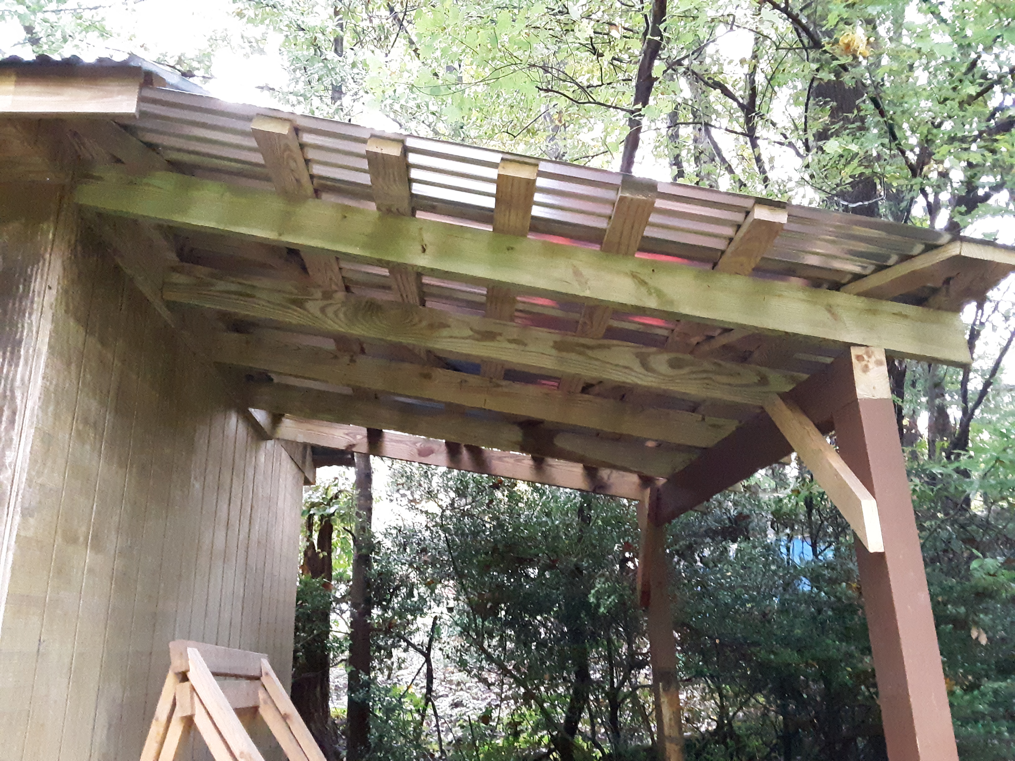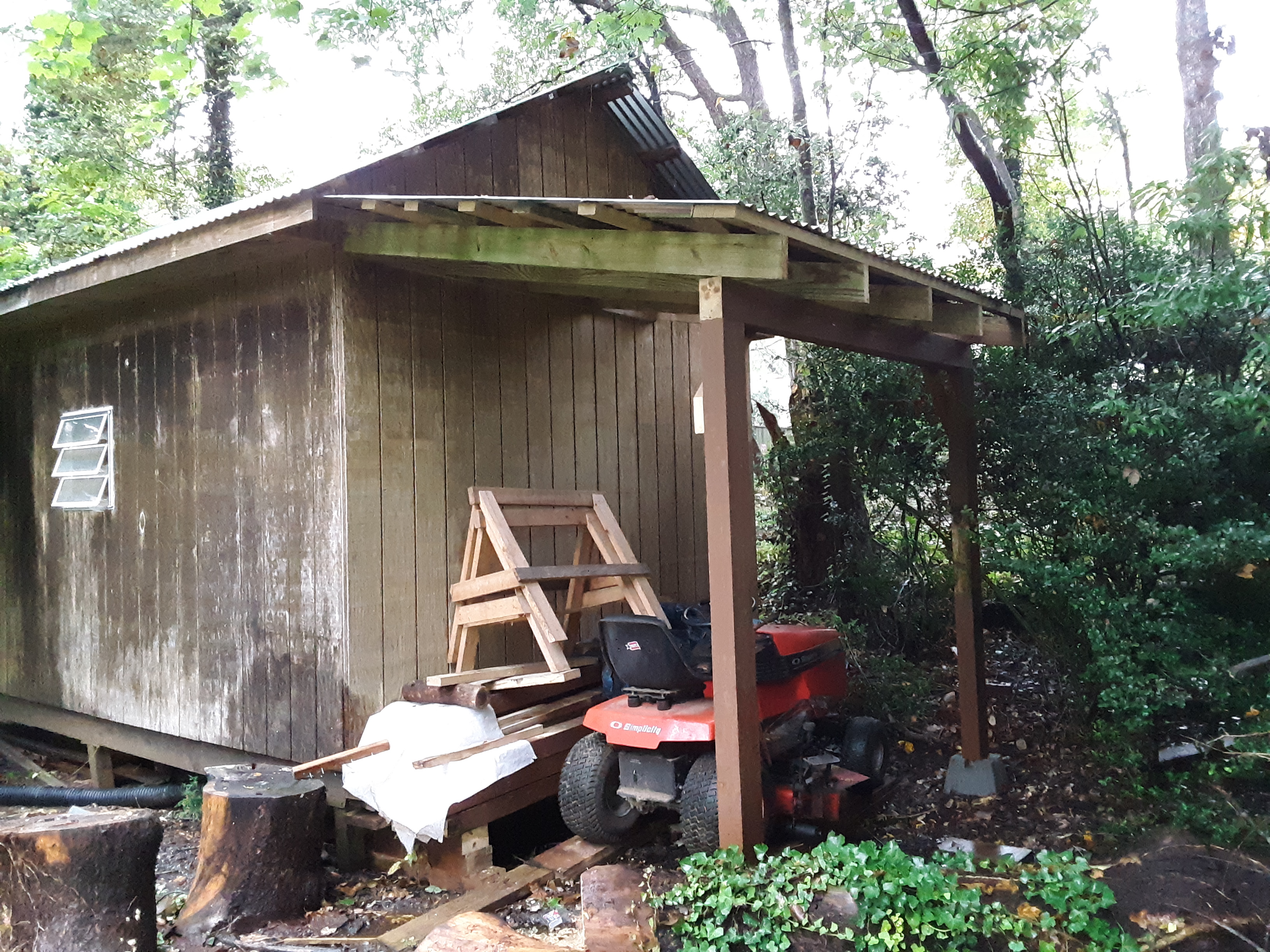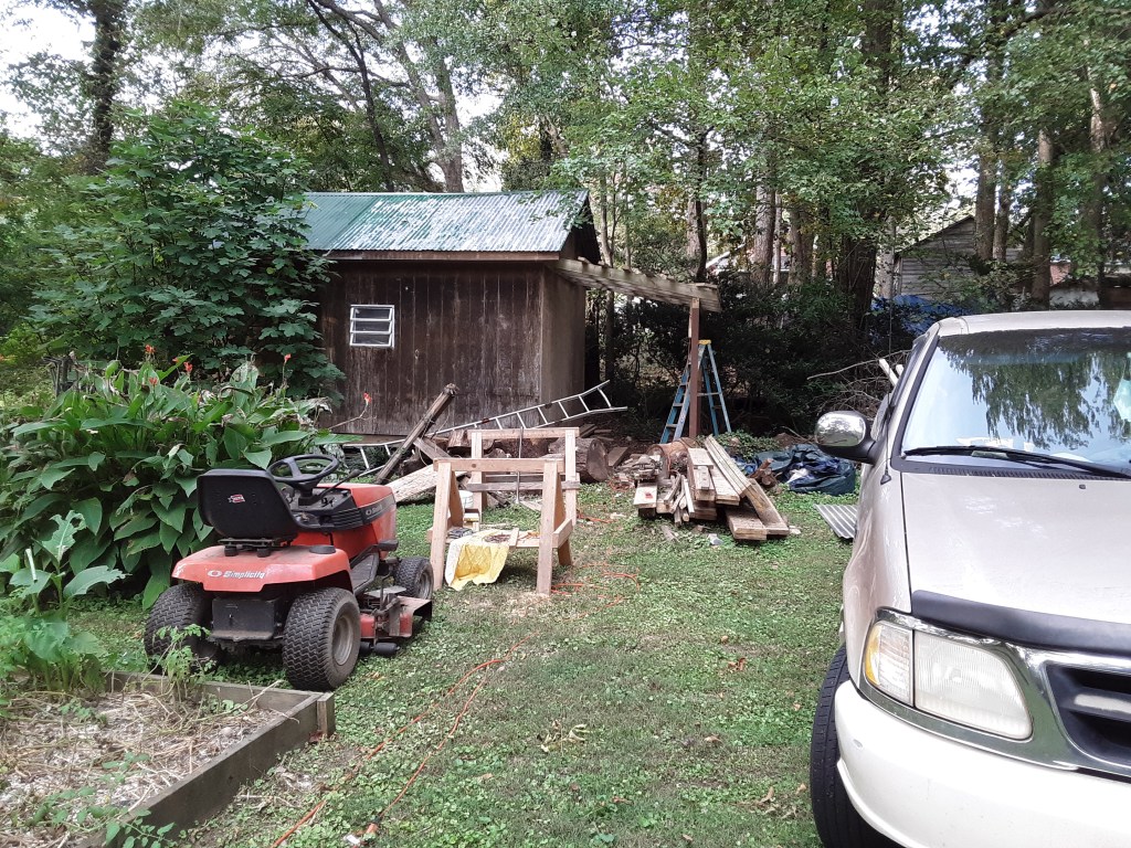 I had bought a used riding mower in exchange for labor earlier in the summer. At 60 years of age, mowing a 3/4 acre lot with a push mower was becoming daunting rather than jaunty. When I first got the mower I parked it under my firewood shed to keep the seat dry and deck from further rust. But as Autumn approached I began considering where to put firewood in the dry if I should ever find any. So, I decided to build a lean to onto the side of my shed. The double doors of the shed were not wide enough for the deck of the mower and would require a tedious rework for the purpose of parking the behemoth in the already crowded storage/workspace. I did not want to buy the lumber since it has gone up considerably of late and this was just used mower. When a job required taking down an old deck, I put the better, slightly deteriorated boards aside into my truck for homegoing. One of my sons thought it impressive that I did the lean to in one day. I really took 3 hours of previous day to clear the space of shrubbery and set up the posts, but my wife did not tell him that. I did not think to catch quite the whole process, but following is my lean to build: