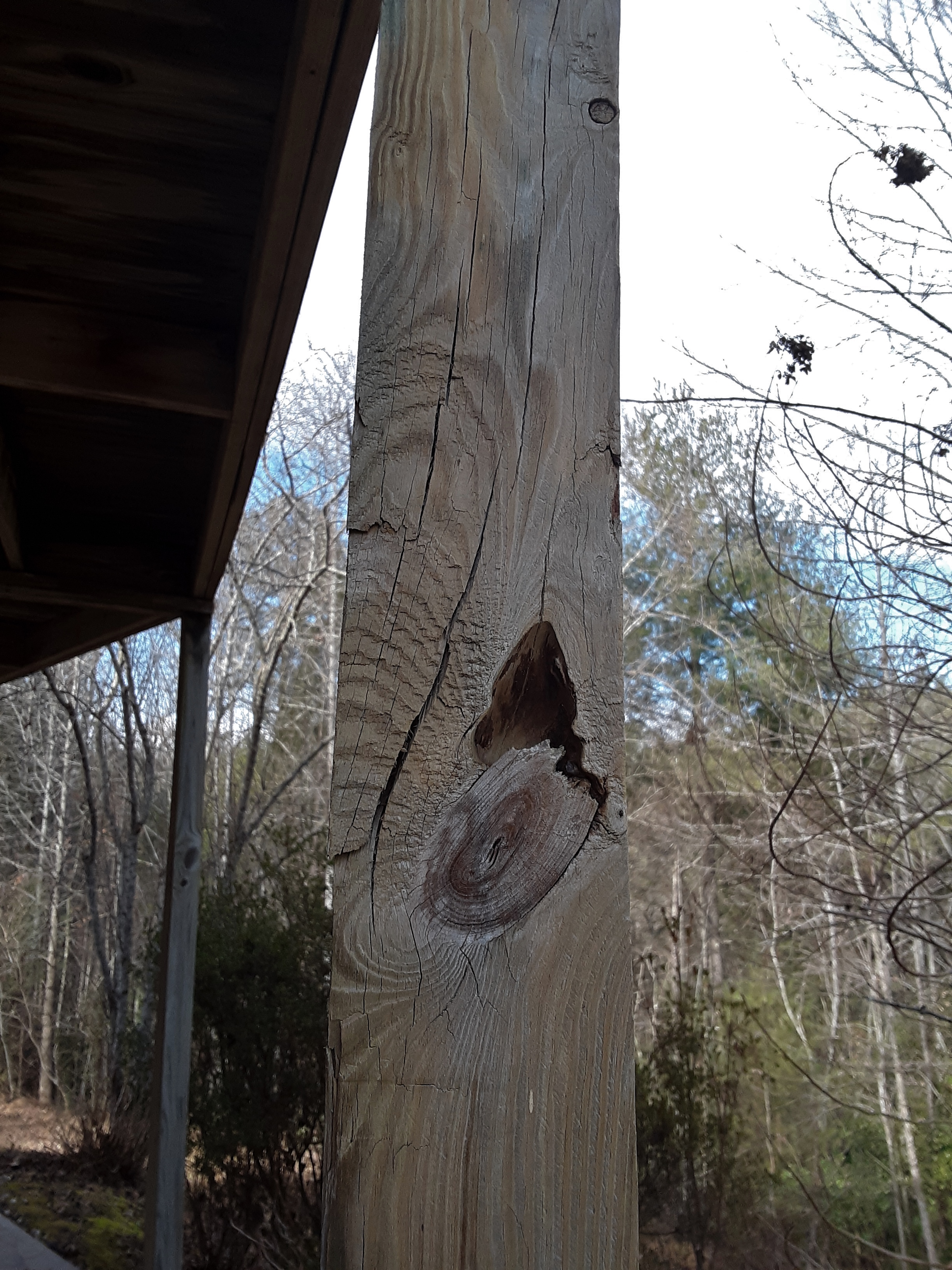 The other one looked as follows. If the grain at the top of the knot split to combine the two cracks, the post would not be far from gone.