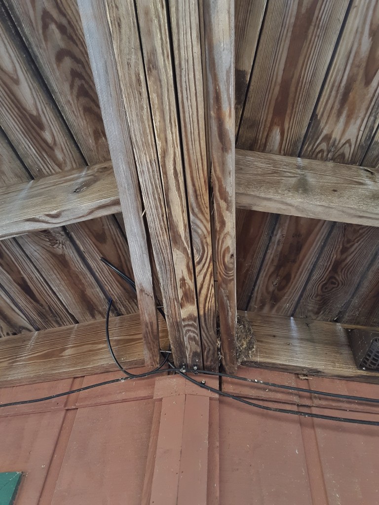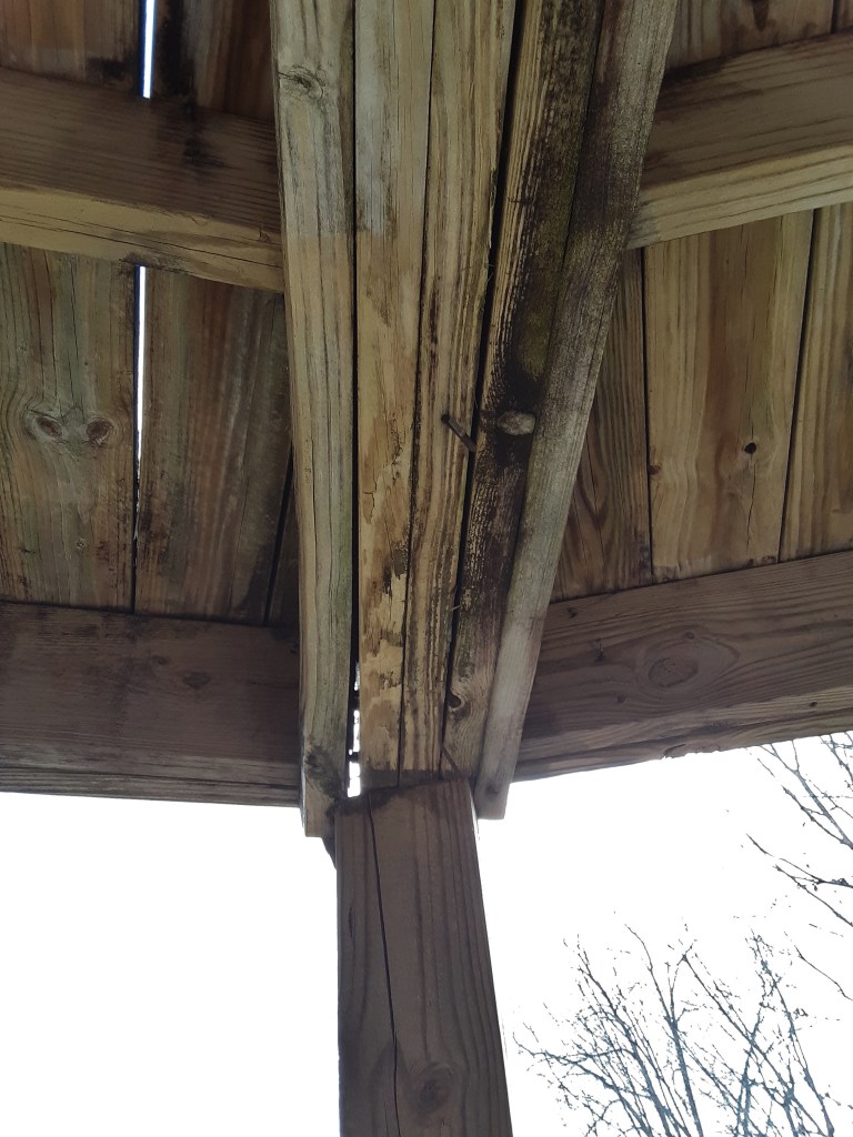 Some of the lumber was quite nice to be used. I had built the shed years before. I had hand built roof trusses that allowed a vaulted ceiling over the middle half of the 20′ long shed. I had plywood gussets at the top and ends of the trusses. It had a large Virginia Pine behind it at one point. On the a Friday after Thanksgiving several years ago while we were away at an extended family gathering, my third son was awakened by a loud crash. He looked outside to see everything covered in copious amounts of ice and the Virginia Pine snapped about three feet up its trunk and lying on the shed. The two foot diameter tree and ice broke one truss which slowed it down enough to only crack others. It was a tedious repair job. The new sheets of roofing did not hold onto the forest green Rustoleum paint very well. I need to sand it and try again.