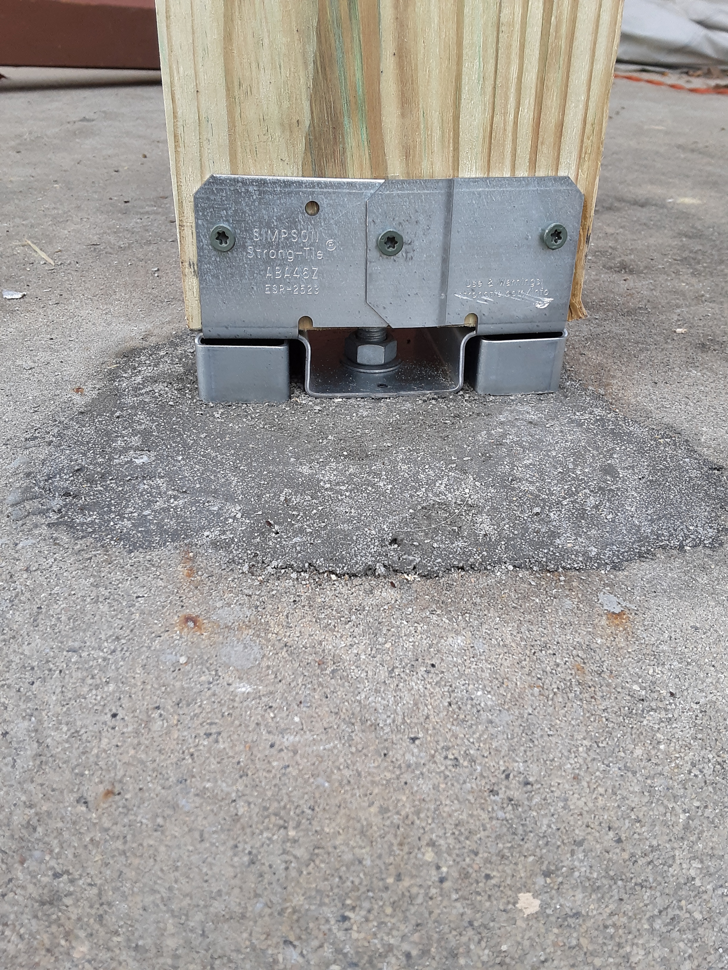 I was surprised how shallow the post was set. The aluminum plate, badly corroded, was sitting on gravel in the hole whereas these plates were usually used to set posts on concrete. There was not too much cracking of the concrete.